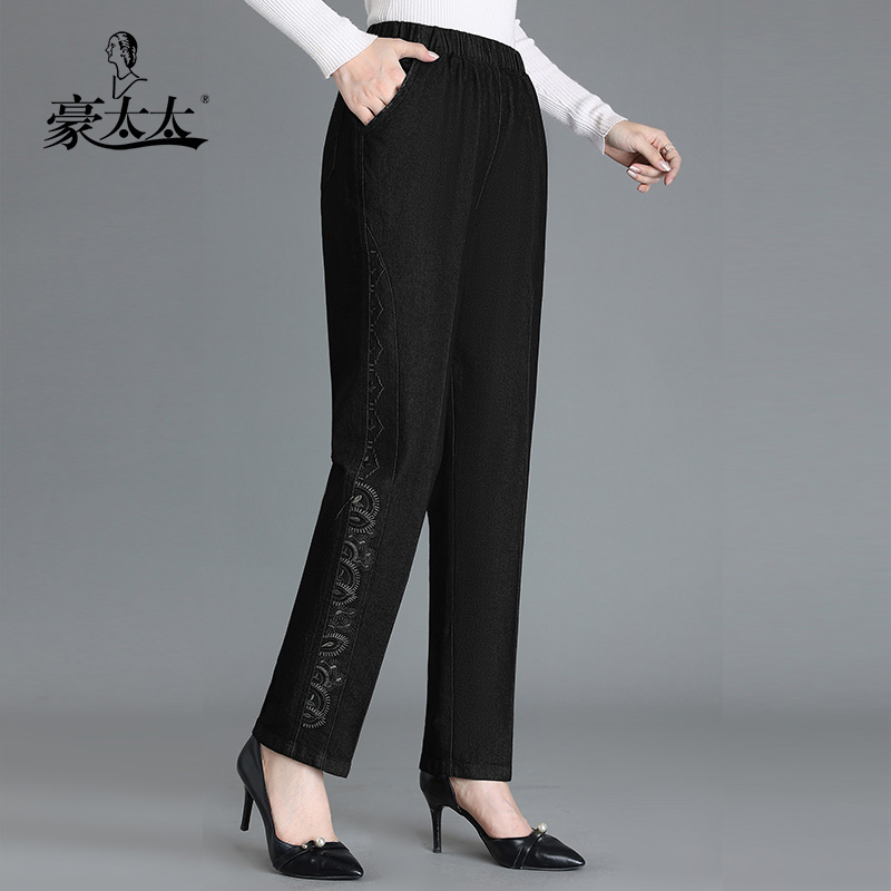 女2025秋冬季 老人裤 中老年女裤 子松紧腰大码 棉质绣花裤 妈妈牛仔裤