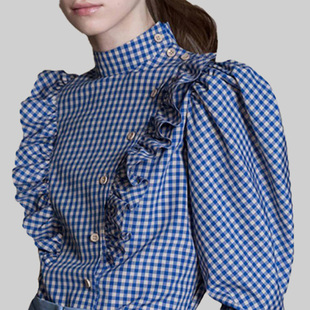 荷叶边修身 女小众衬衣长袖 显瘦上衣 立领印花格子衬衫 2025年秋新款