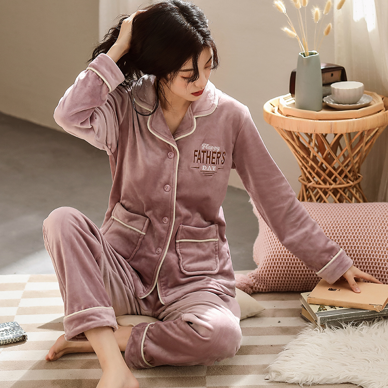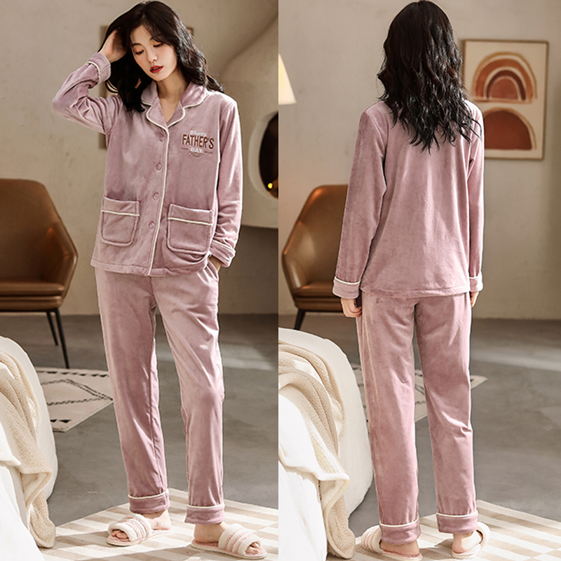 大码 春秋开衫 女士家居服 加厚珊瑚绒睡衣女冬法兰绒加绒套装 秋冬季