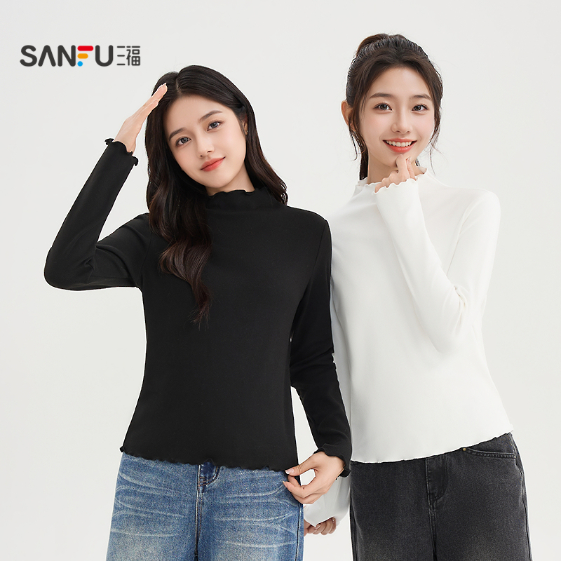 504427 木耳边领优雅加厚保暖内搭上衣女装 三福长T恤2025秋冬季