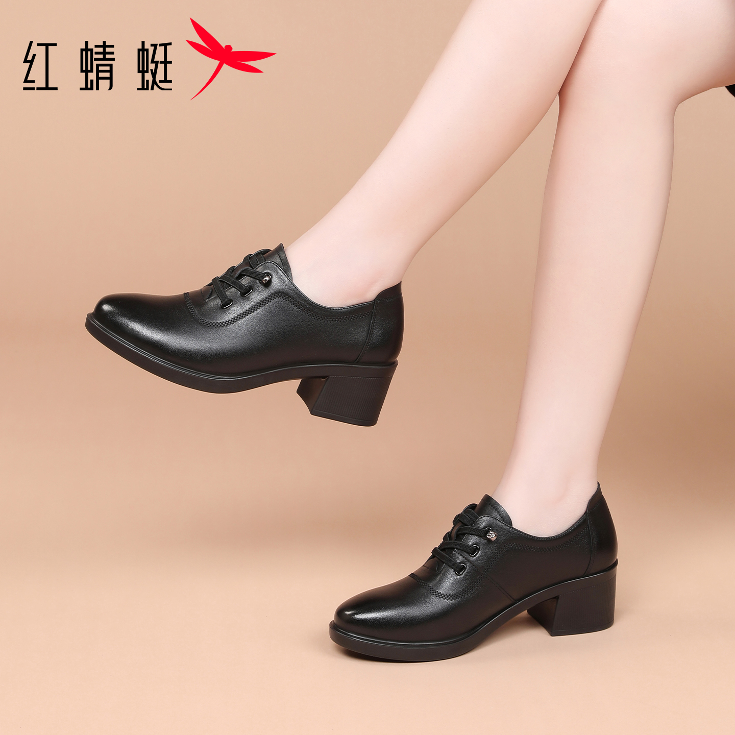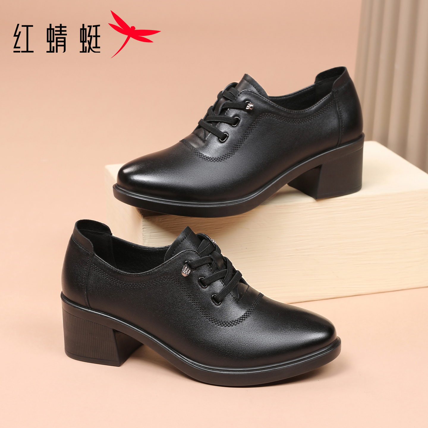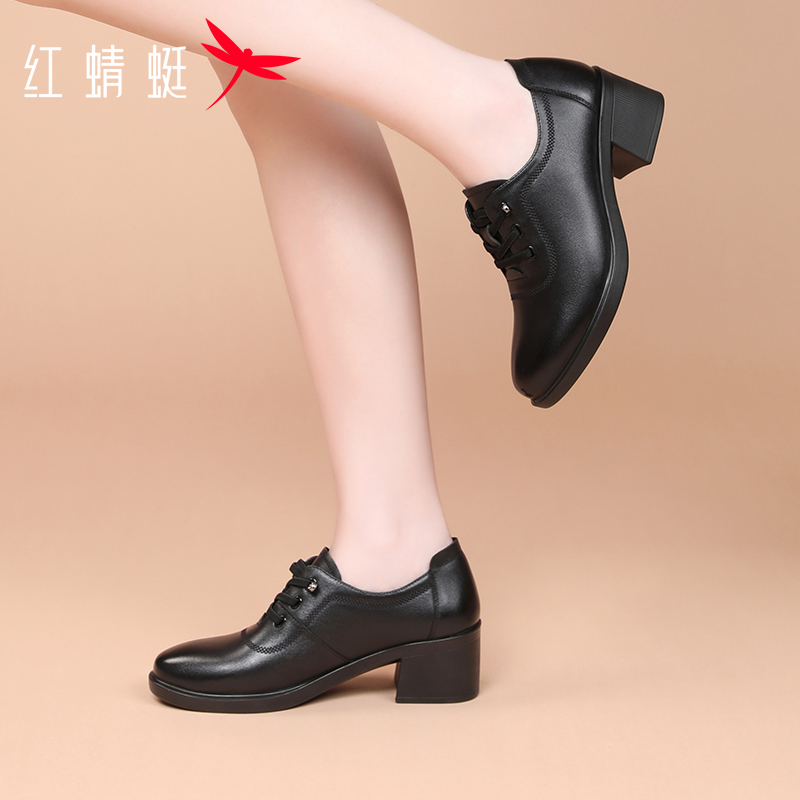 免系带真皮粗跟高跟妈妈单鞋 女2025新款 通勤工作小皮鞋 红蜻蜓女鞋