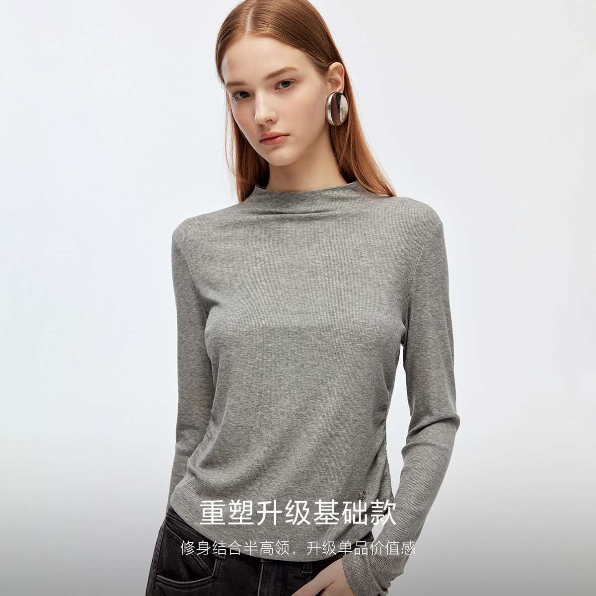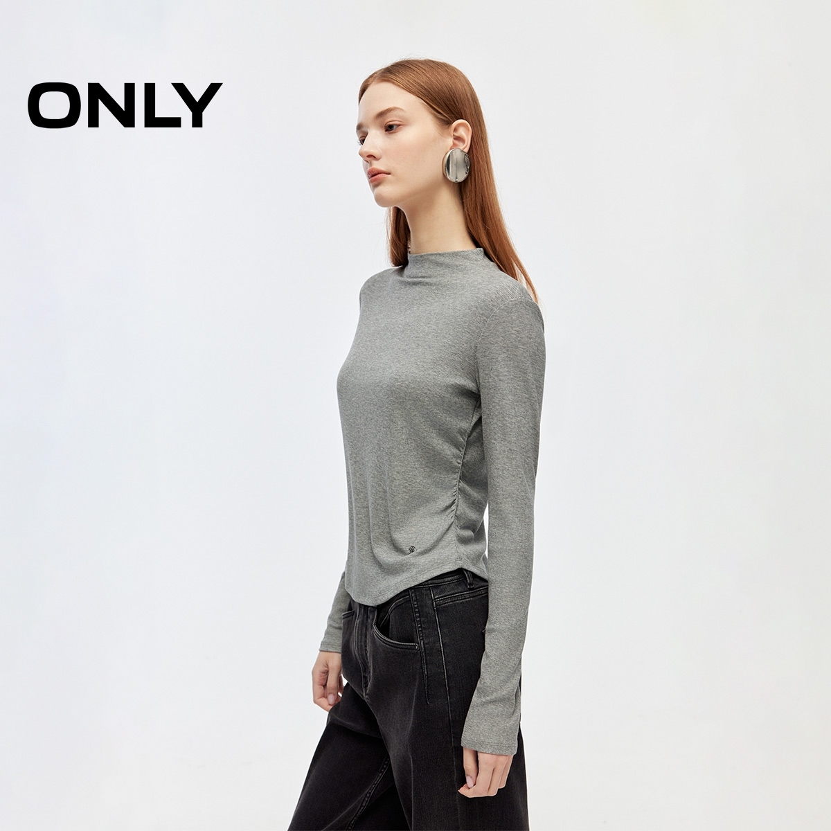 纯色弹力长袖 舒适亲肤两侧捏褶螺纹修身 T恤女 新款 ONLY2025秋季