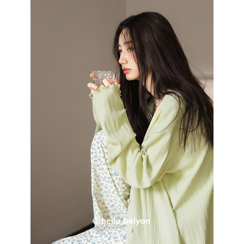 外套中长款 贝妍新款 开衫 小清新V领长袖 柔软棉睡裙 睡衣女士春秋季