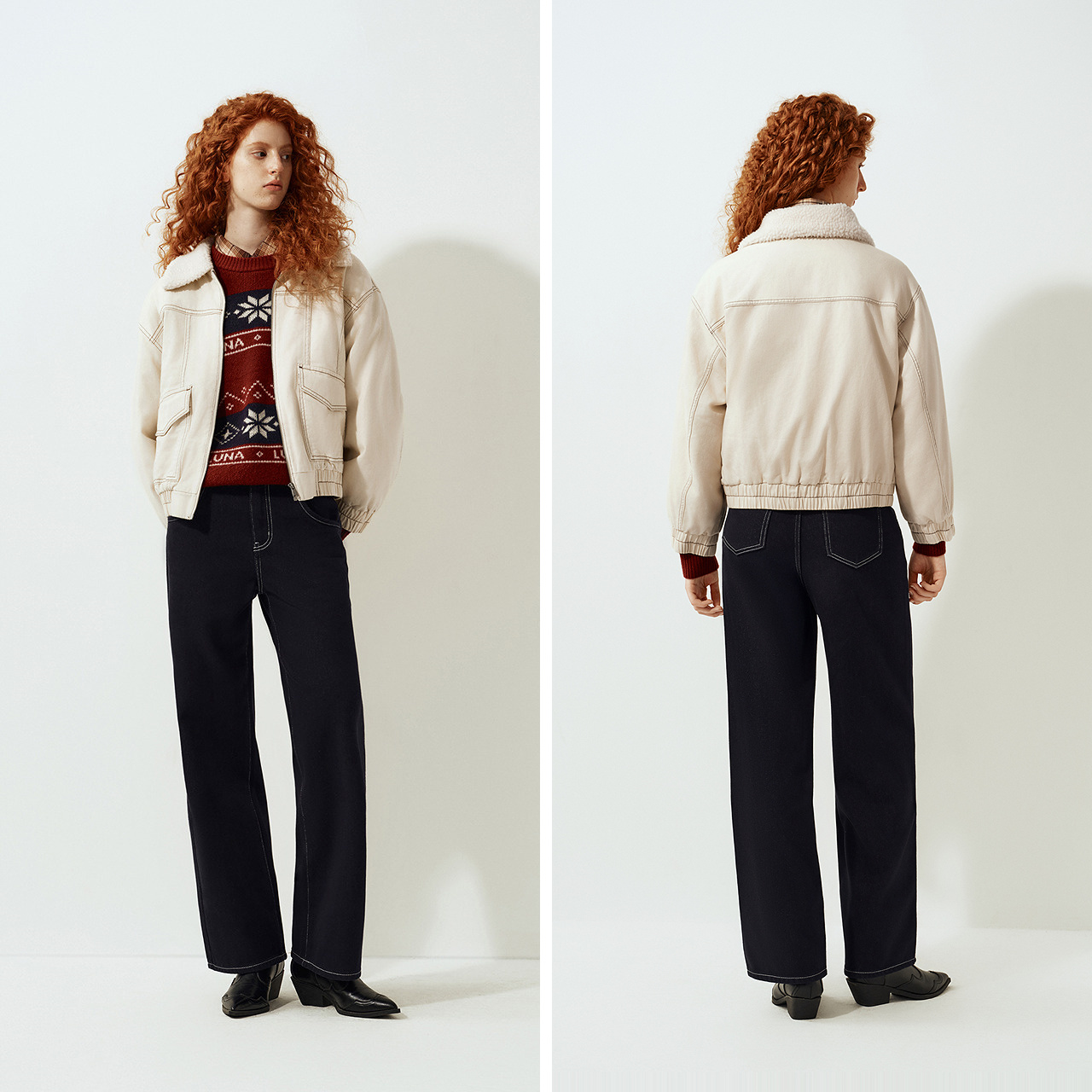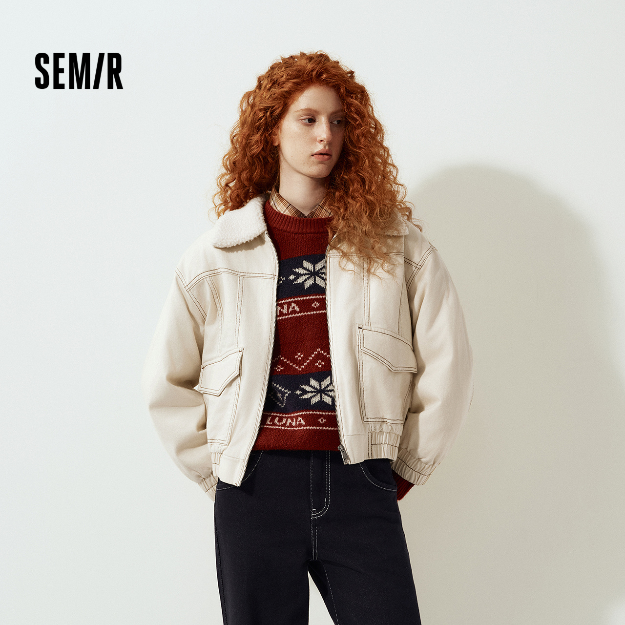 风夹克 潮酷工装 森马牛仔外套女冬季 仿羊羔毛翻领夹棉宽松2025新款