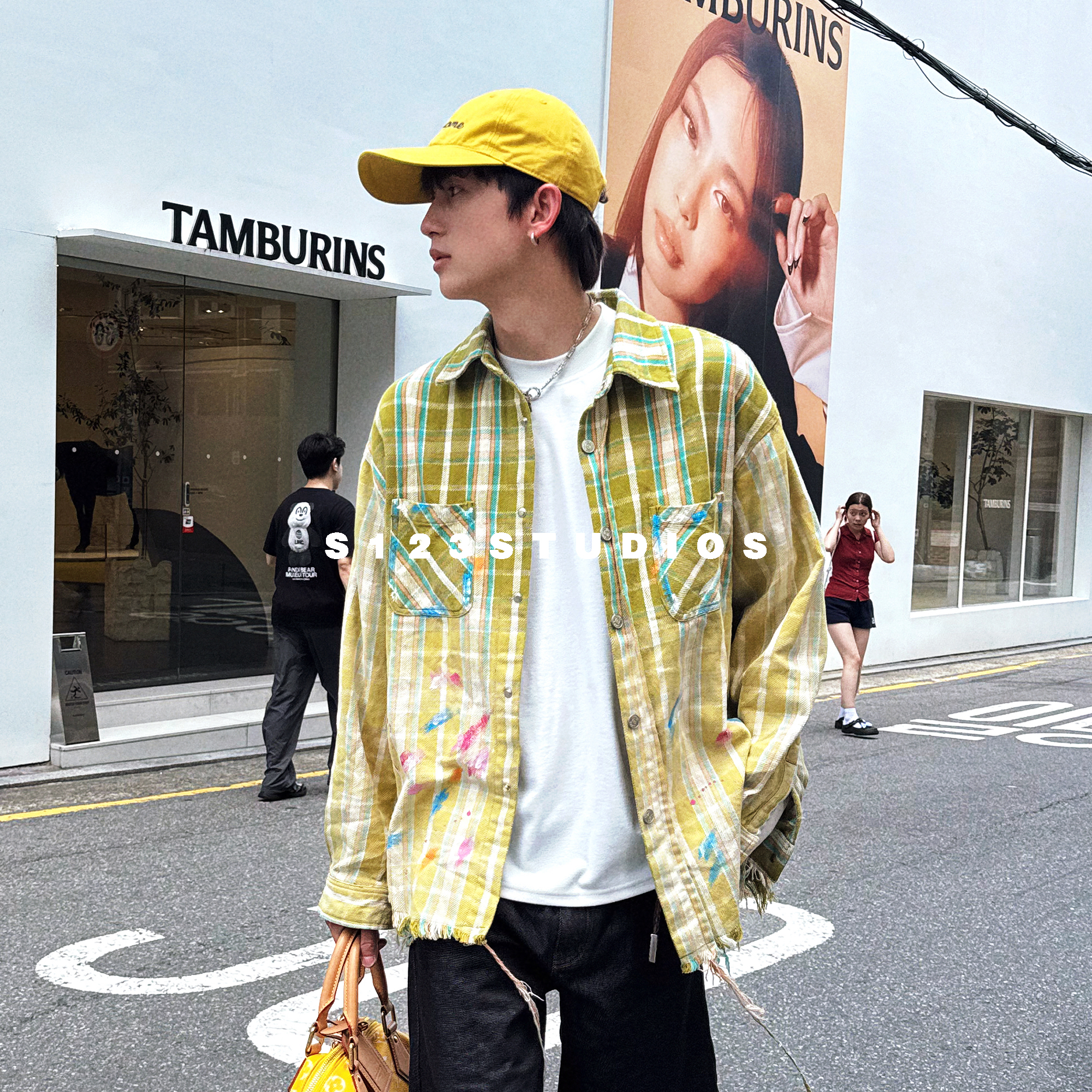 外套男宽松休闲开衫 衬衫 渐变晕染设计感涂鸦喷绘格子长袖 S123