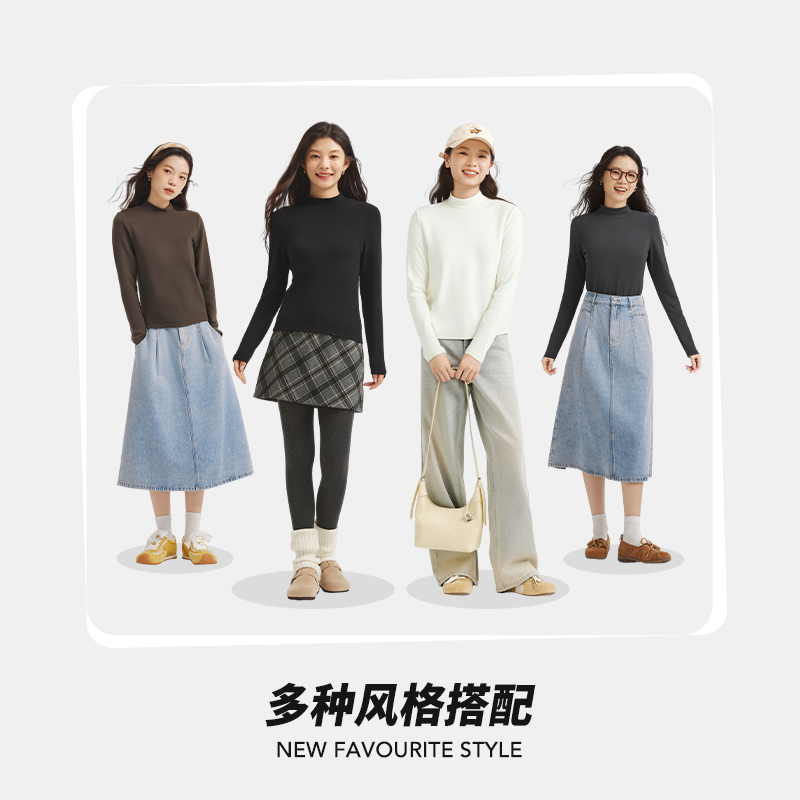 热风2025年冬季 女士半高领舒适长T基础纯色柔软舒适软糯亲肤 新款