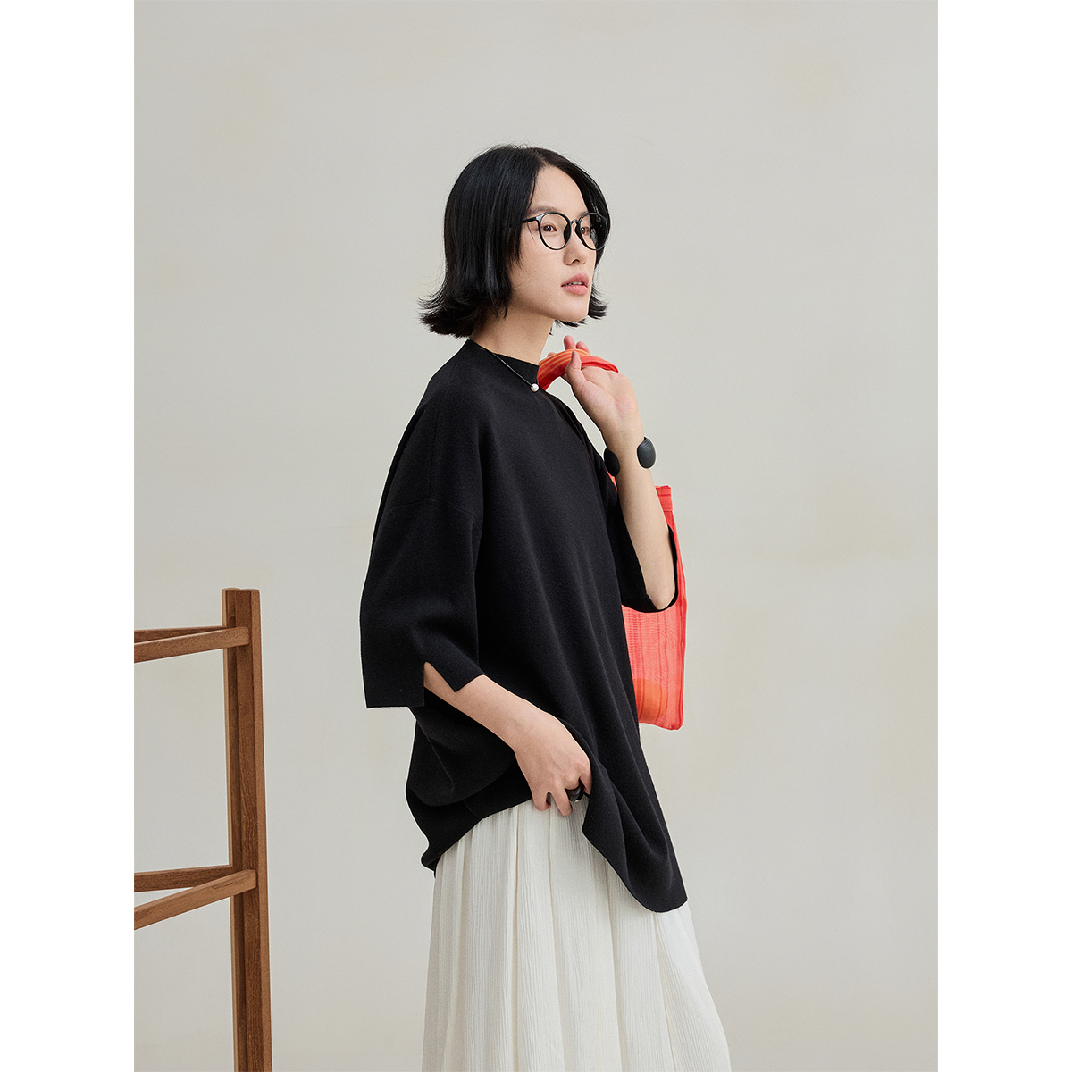 麻霖原创设计绵羊毛混纺爬领中袖 简约气质中长针织套头衫