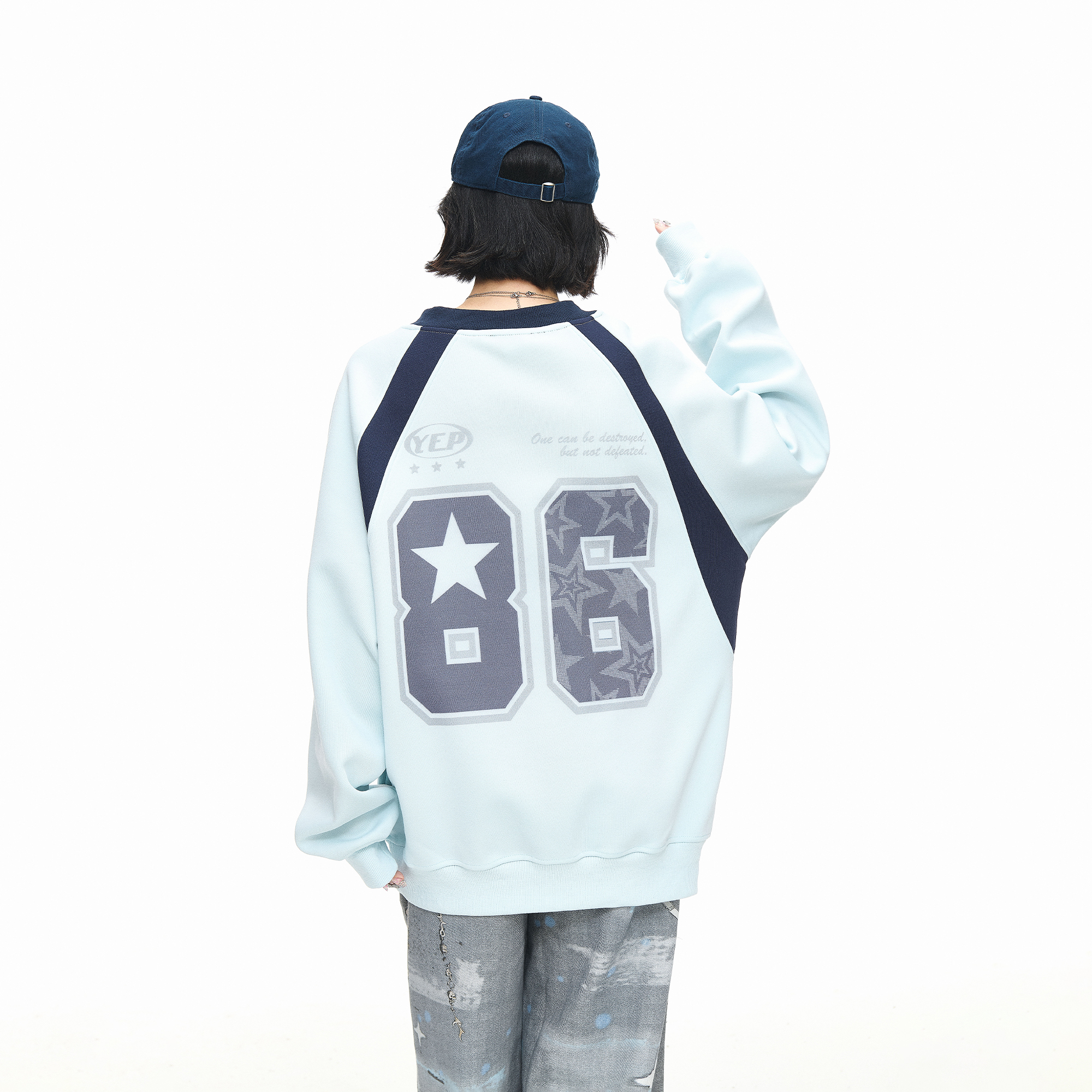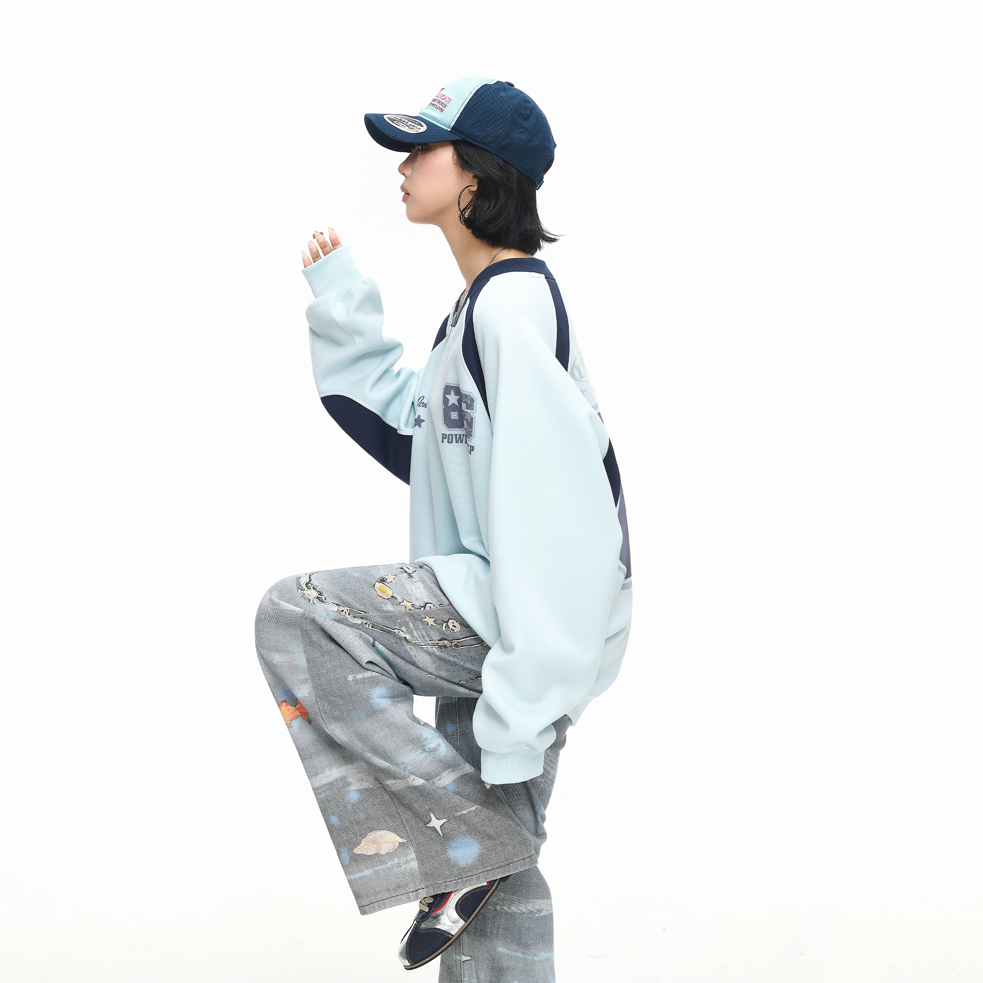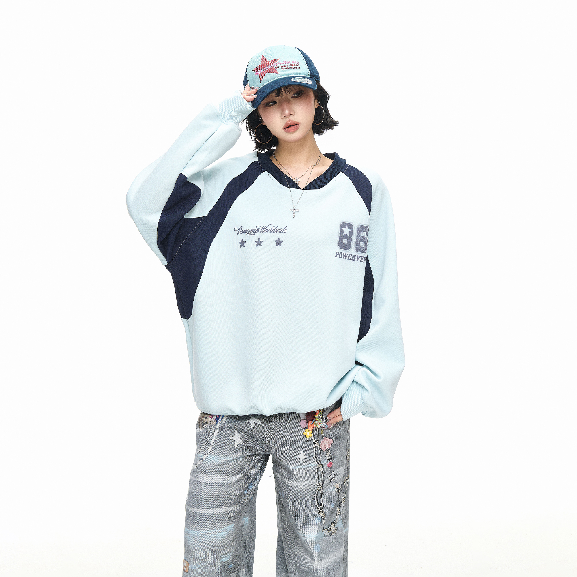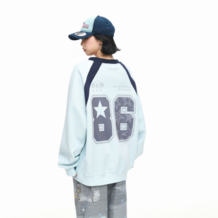 宽松休闲男女同款 V领卫衣女春秋新款 上衣 复古数字印花插肩袖 美式