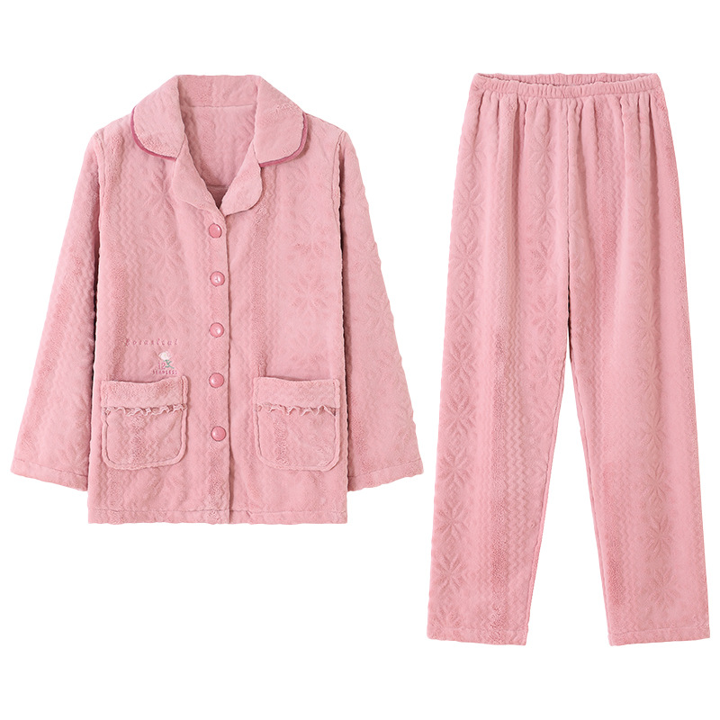 大码 春秋开衫 女士家居服 加厚珊瑚绒睡衣女冬法兰绒加绒套装 秋冬季