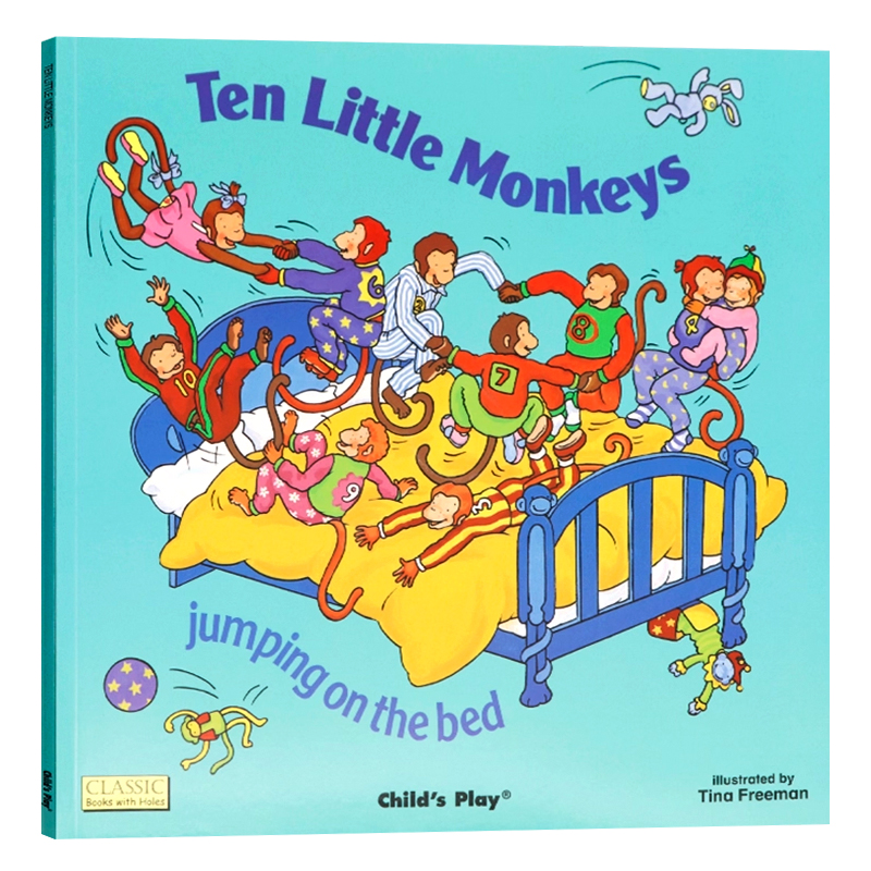 the Play 英文原版 十只猴子在床上蹦蹦跳跳 Child Ten bed jumping 韵文歌谣洞洞书二辑带CD版 Monkeys Little 儿歌 经典 绘本