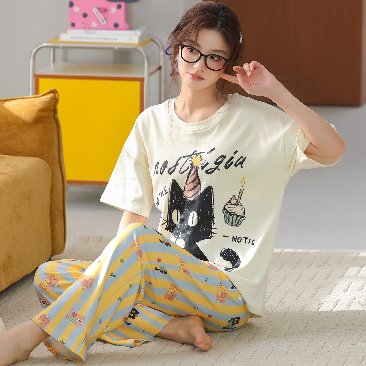 夏季 卡之恋睡衣女款 条纹卡通2025新款 带胸垫长裤 家居服 夏纯棉短袖
