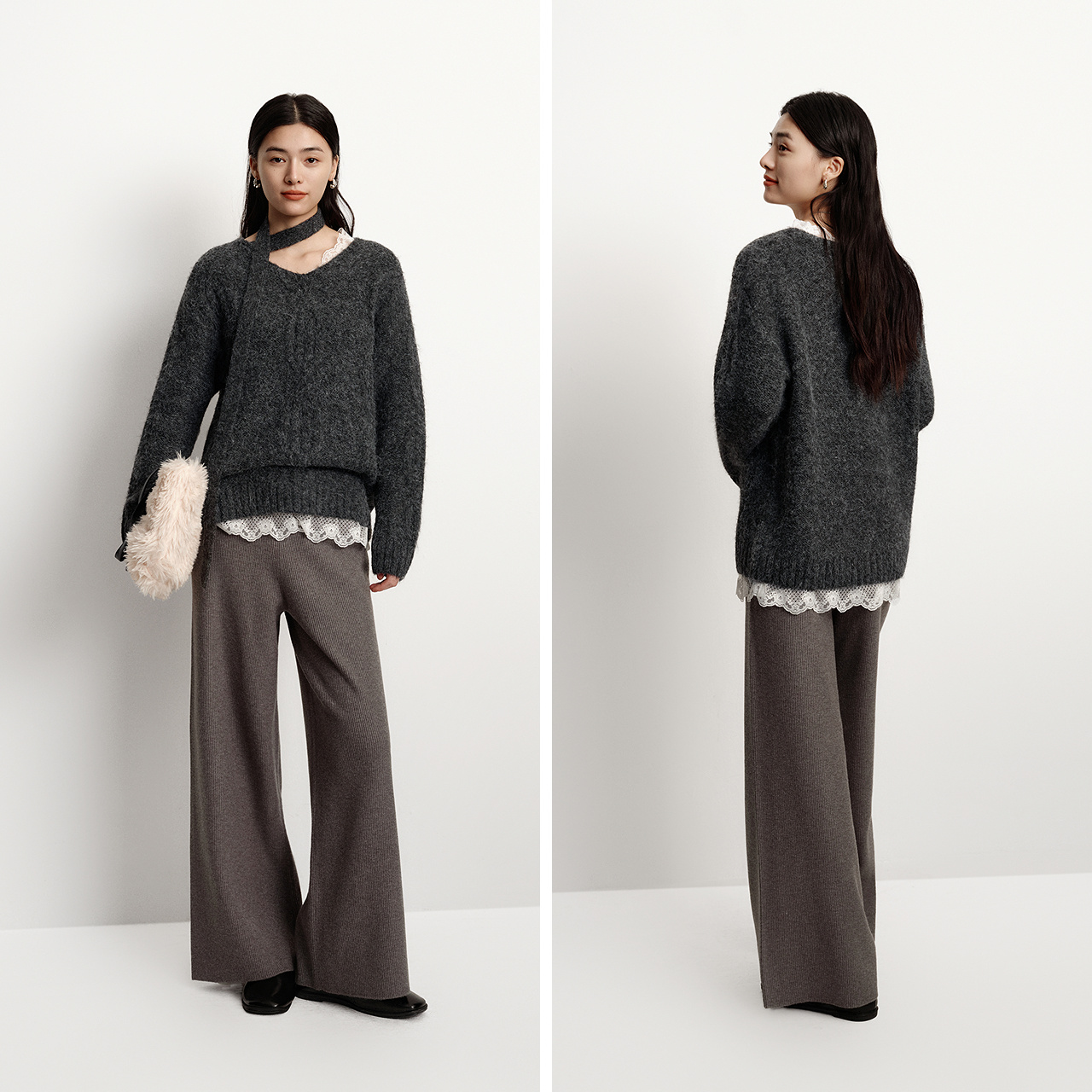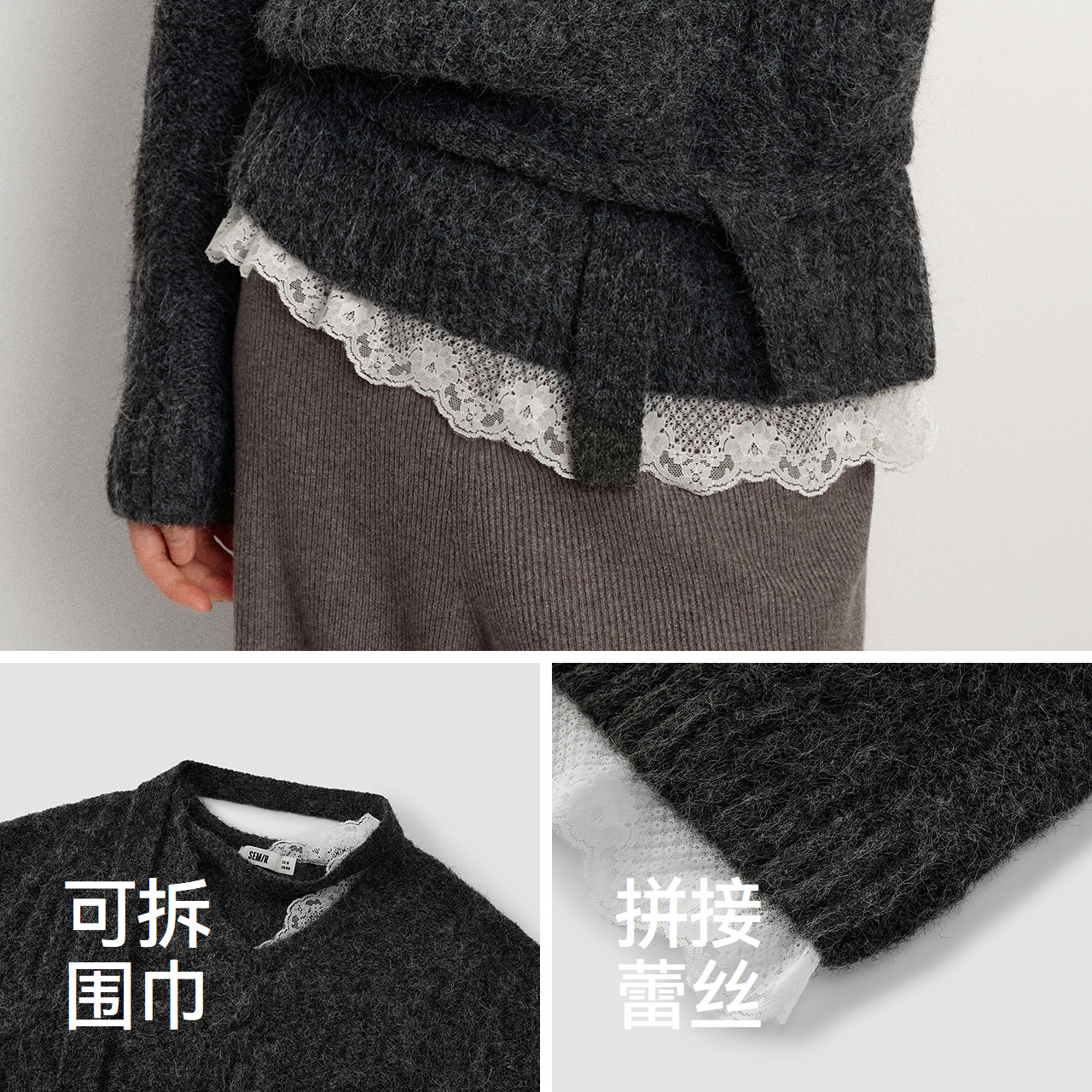 森马毛衣女冬围巾蕾丝V领绞花宽松2025新款 慵懒优雅小性感套头衫