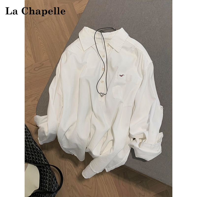 拉夏贝尔白色polo领长袖 女初秋韩系穿搭松弛感半开襟休闲上衣 衬衫