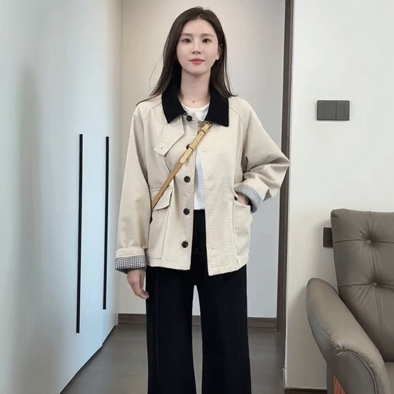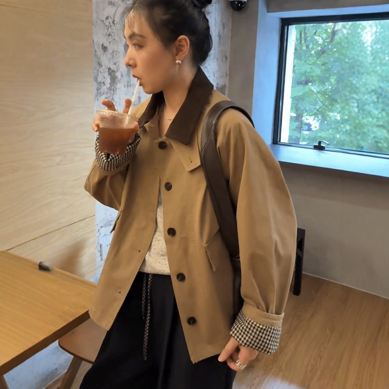 拼接夹克上衣 小个子简约百搭短款 撞色格子风衣外套女2025冬季 新款