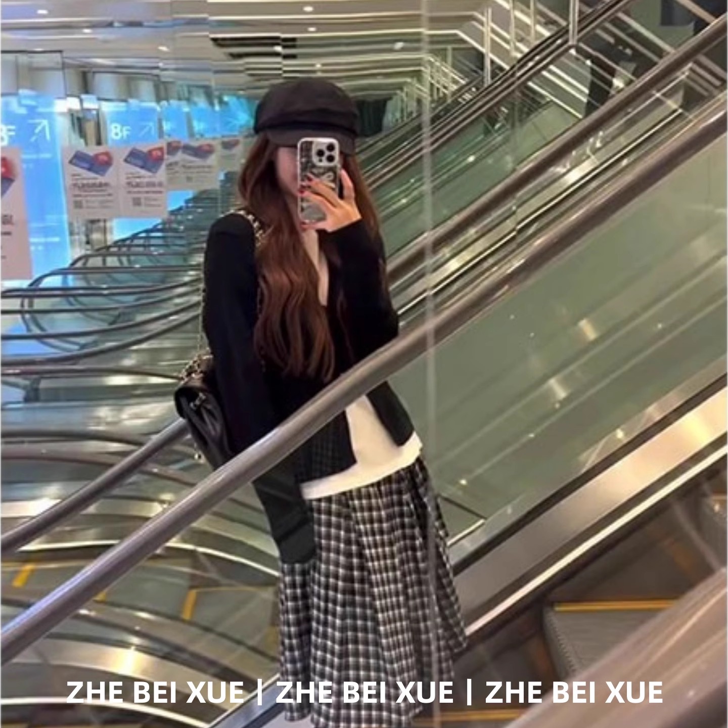 秋装 格子半身裙子巨好看 一整套 女韩系黑色V领绑带针织开衫 套装