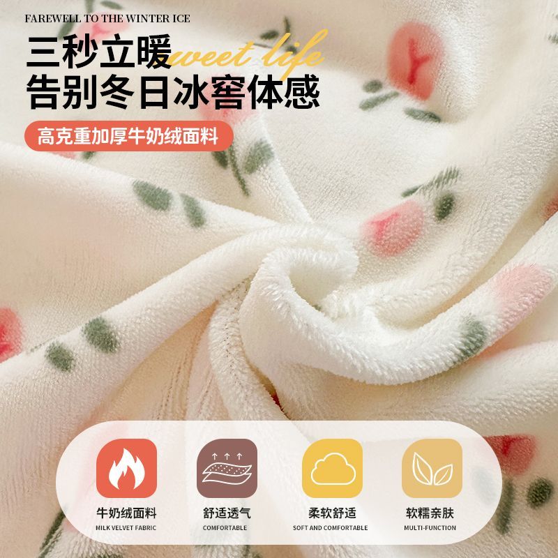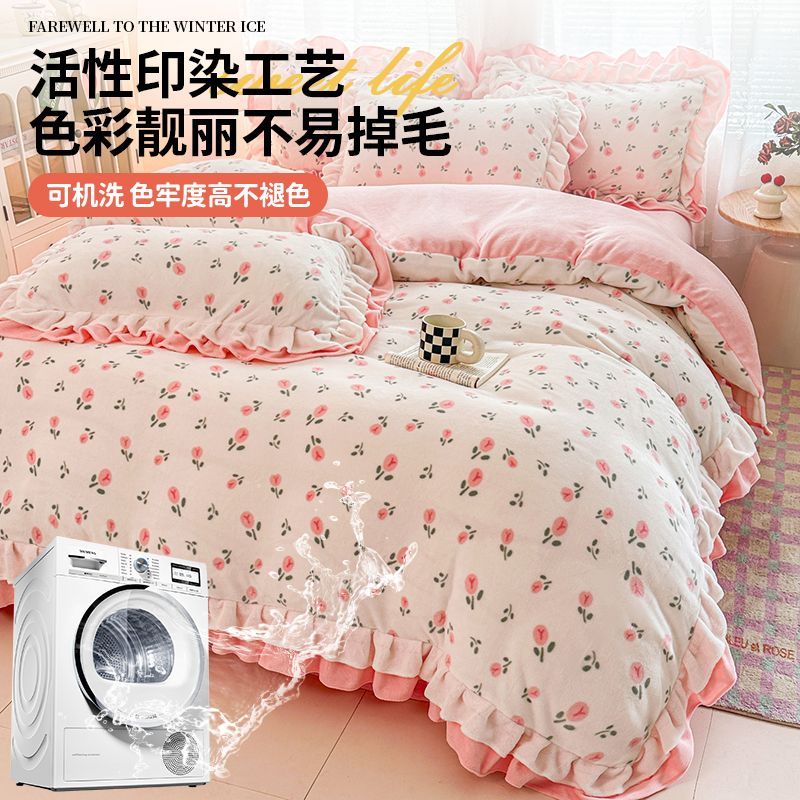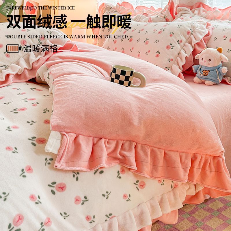 ABS秋冬公主风花边床上牛奶绒四件套床品双面加绒被套床单三件套