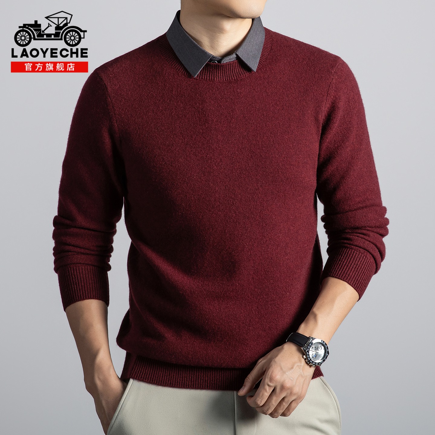 新款 2025秋冬季 打底线衣假两件针织毛衣男 男士 老爷车100%纯羊毛衫
