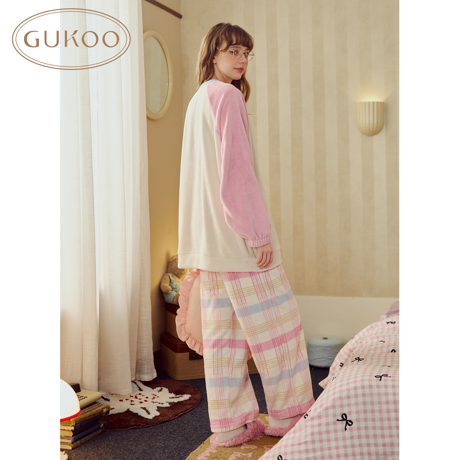 柔软宽松长袖 格子绒绒抗静电睡衣套装 家居服508344 三福女冬季