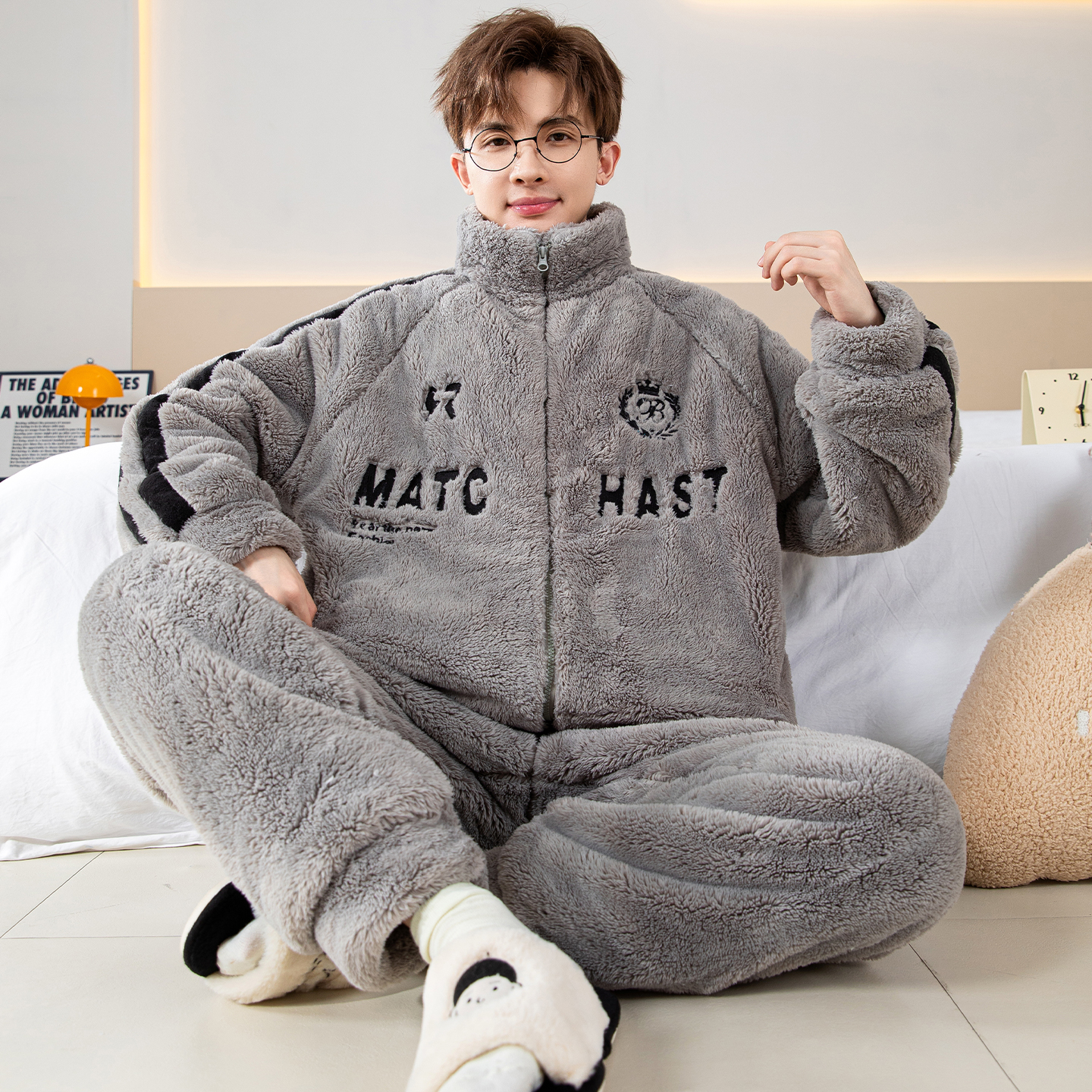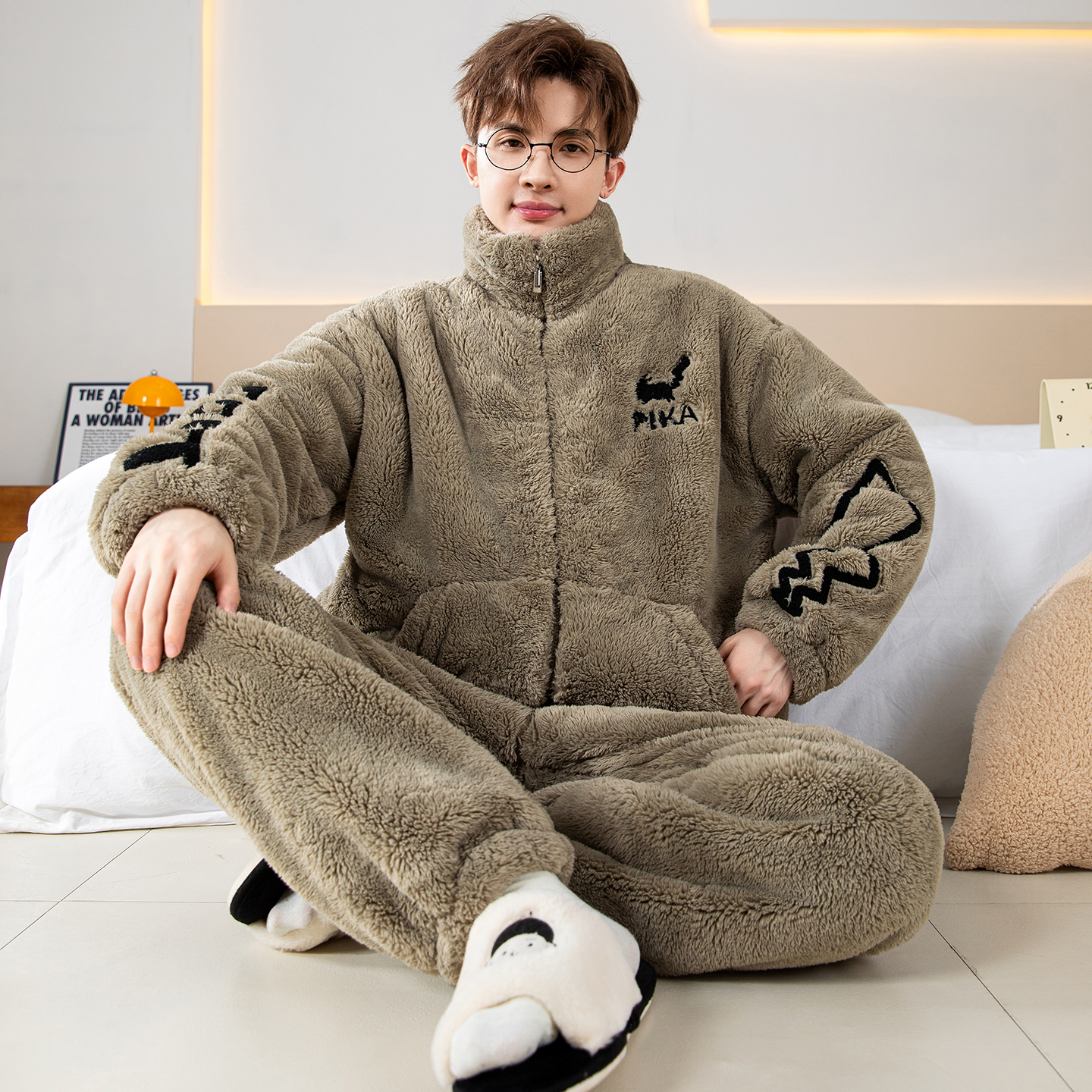 大码 春秋开衫 女士家居服 加厚珊瑚绒睡衣女冬法兰绒加绒套装 秋冬季