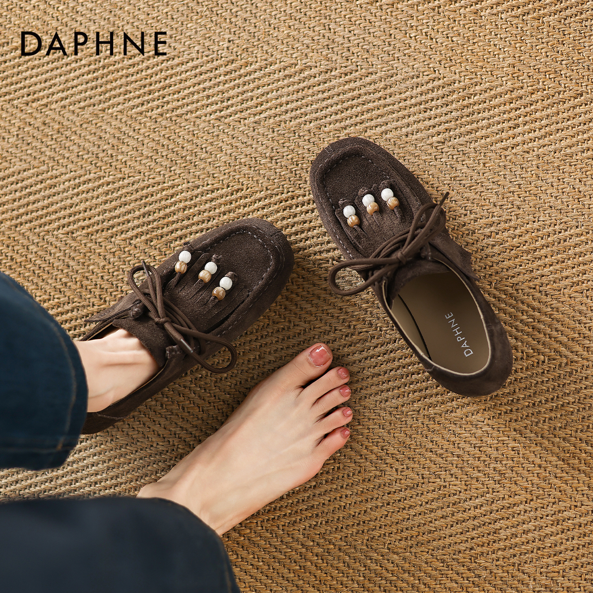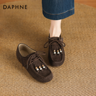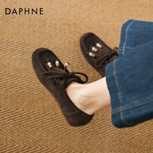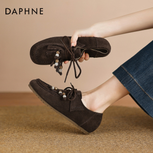 女2025新款 单鞋 秋季 真皮袋鼠鞋 复古软底豆豆鞋 达芙妮老钱风乐福鞋