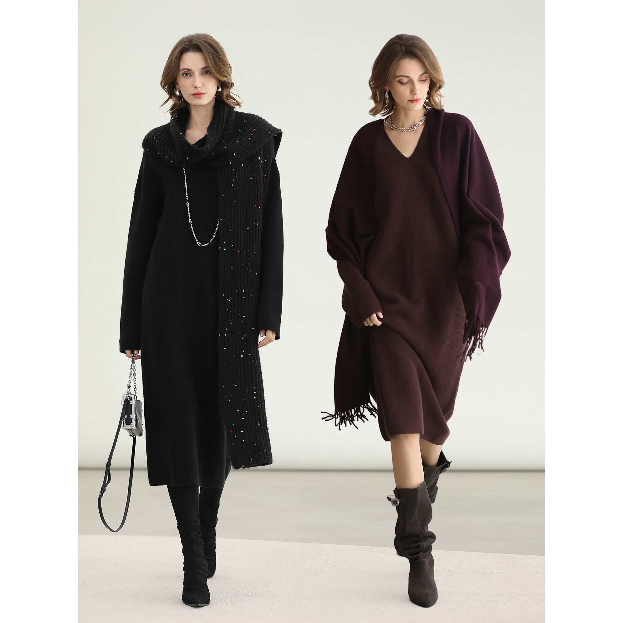新款 朗姿纯羊毛v领收腰显瘦针织长裙设计感连衣裙冬季 免定金