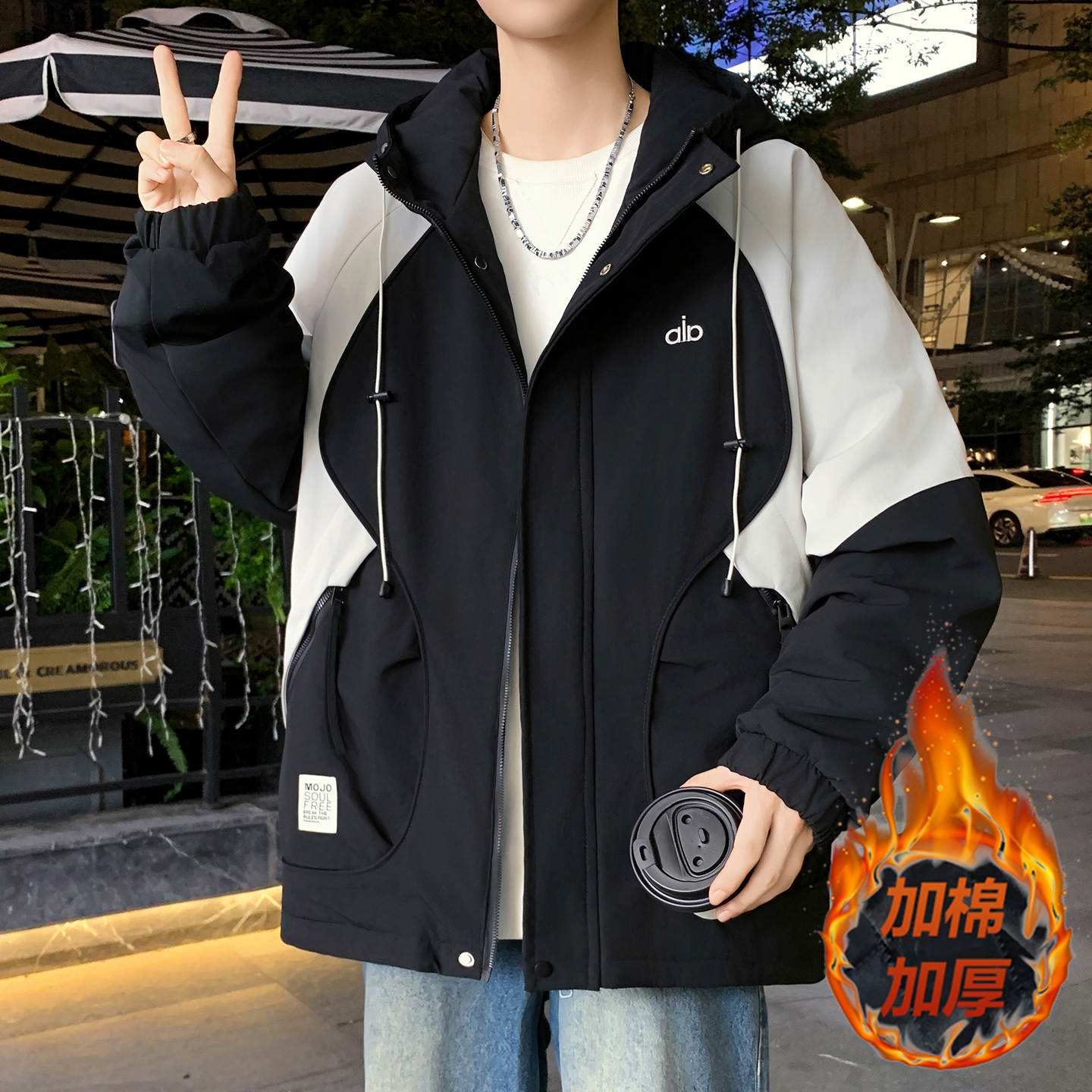 查尔斯桃心2025年新款 可拆卸连帽牛仔夹克男磨白单排扣多口袋外套