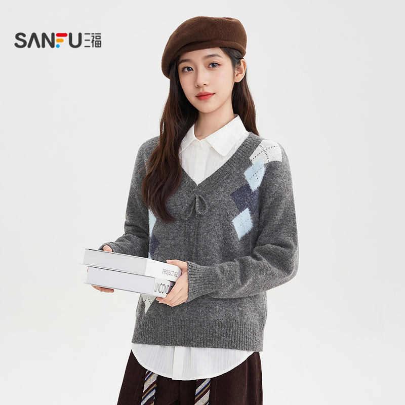 上衣女装 韩系撞色翻领假两件毛针织衫 508196 秋季 三福毛衣2025新款