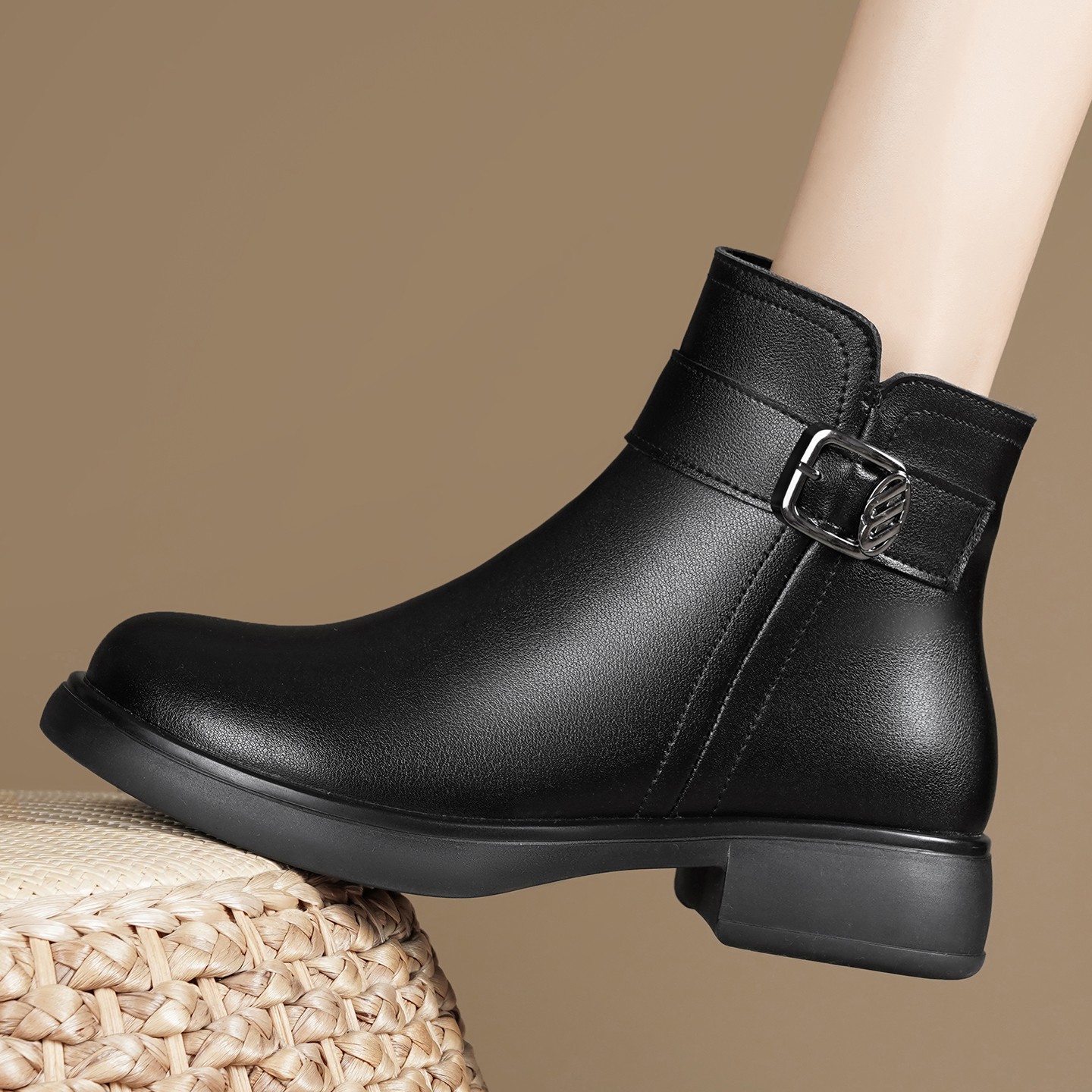 棉鞋 加绒保暖加厚短靴女粗跟中跟真皮羊毛妈妈鞋 女靴冬季 2025新款