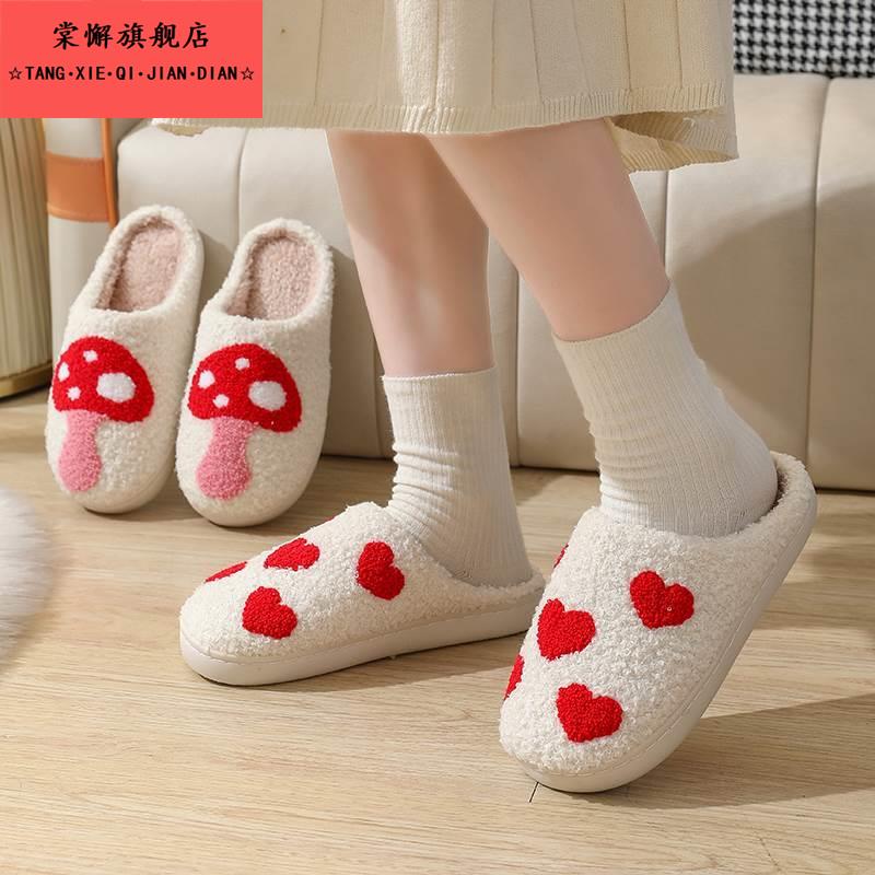 加绒亲子家庭装 情侣拖鞋 女室内家居家毛绒保暖月子鞋 爱心冬棉拖鞋