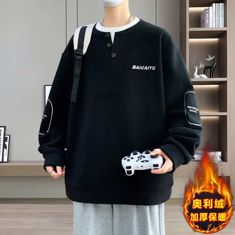 打底衫 秋冬季 休闲青年百搭假两件V领长袖 潮流时尚 奥利绒卫衣男士
