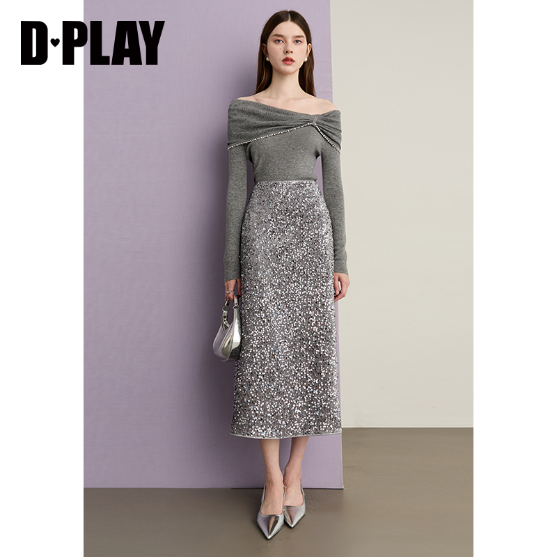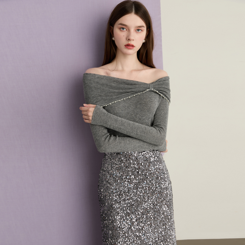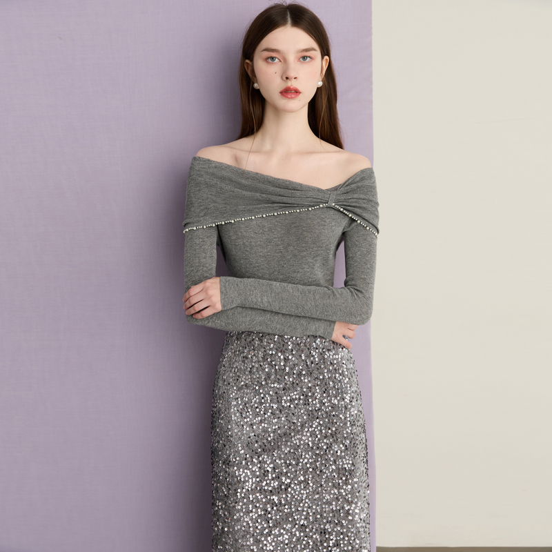 女气质流行长袖 灰色一字肩针织打底衫 上衣 新款 DPLAY2025秋季