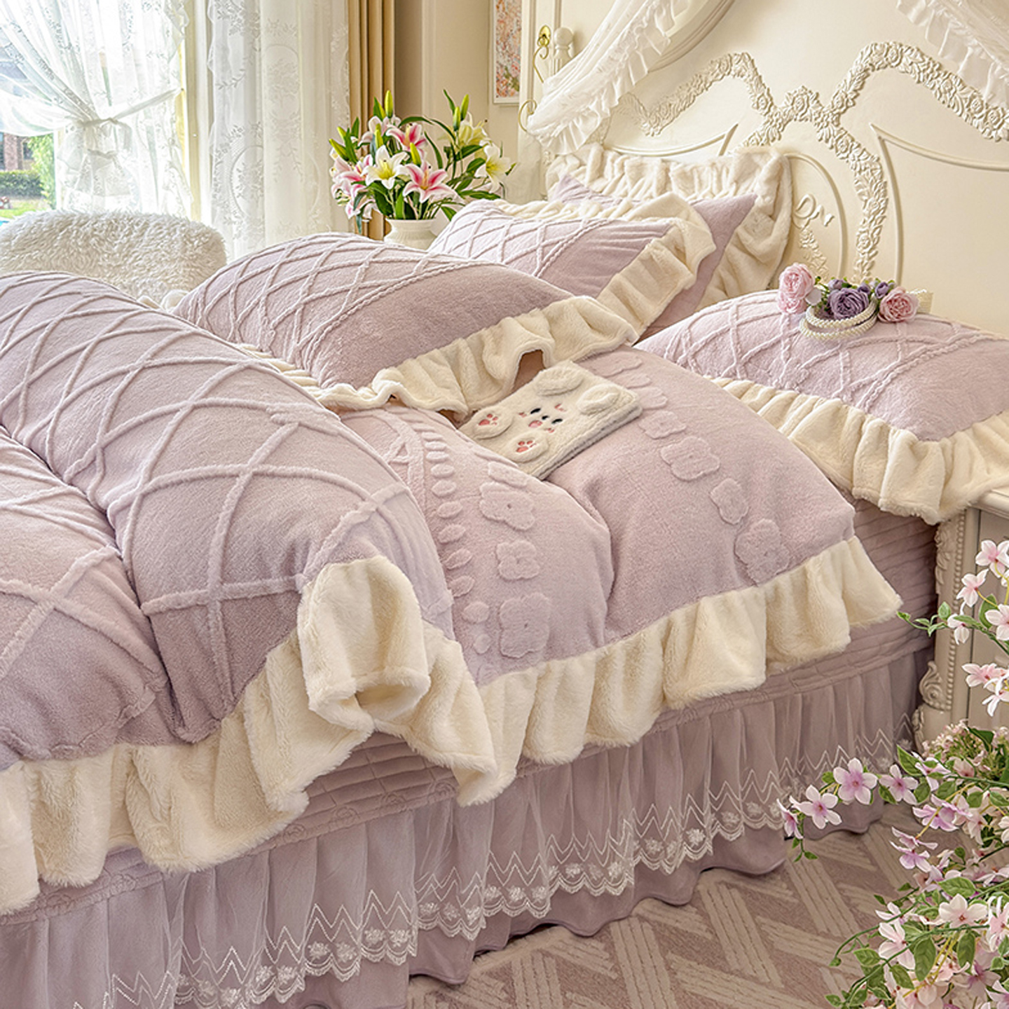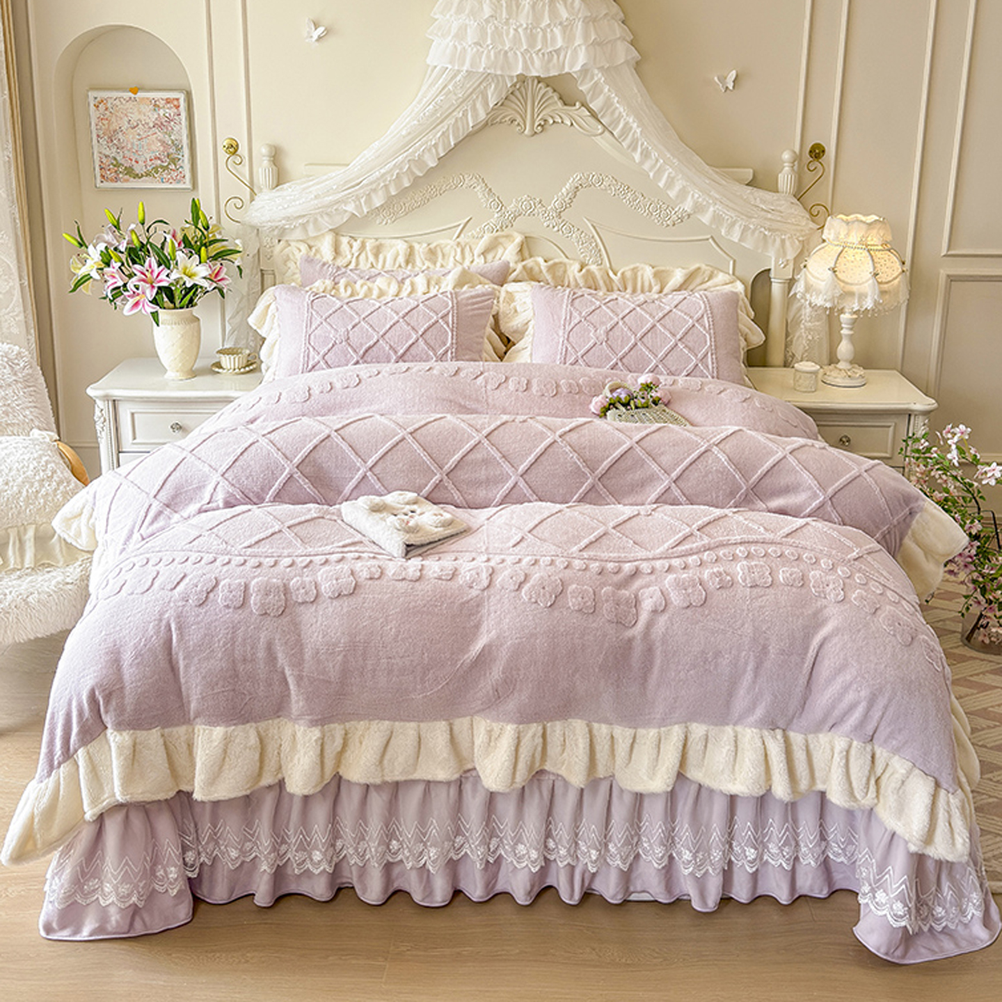 高端立体提花兔绒牛奶绒夹棉床盖款 四件套加厚保暖花边被套床上冬