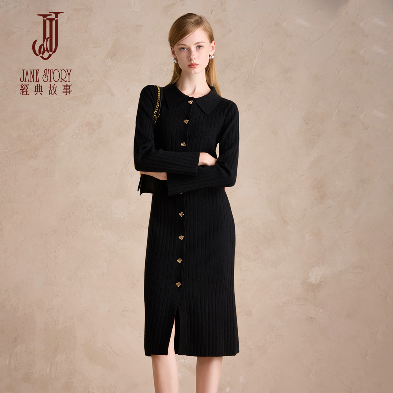 黑色翻领针织连衣裙女2025肌理感长袖 裙子 秋冬时髦设计羊毛中长款