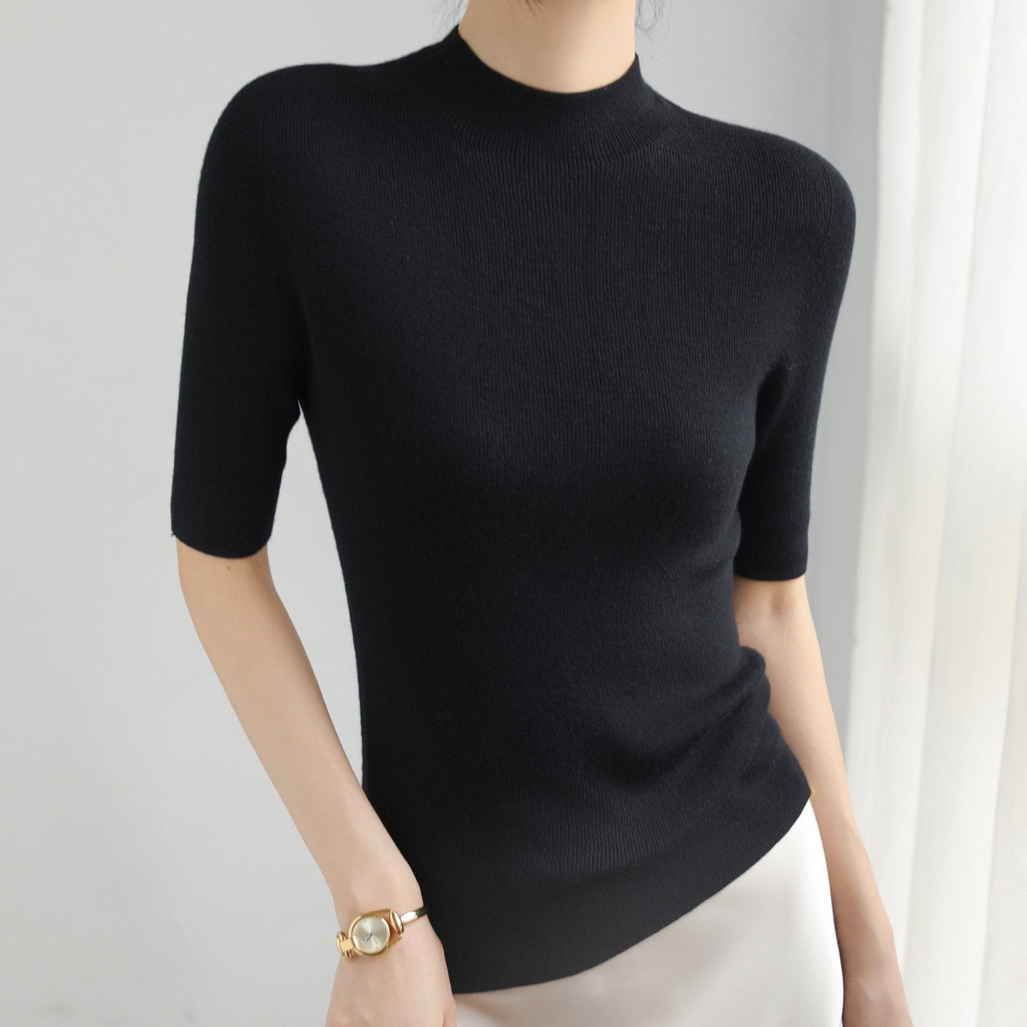 女秋季 新款 修身 法式 大码 针织衫 显瘦五分袖 胖MM打底上衣 半高领中袖