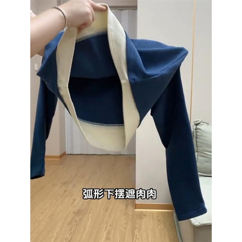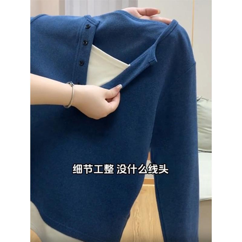 胖mm宽松显瘦打底衫 大码 正肩1009u T恤女士新款 秋冬蓝色假两件长袖