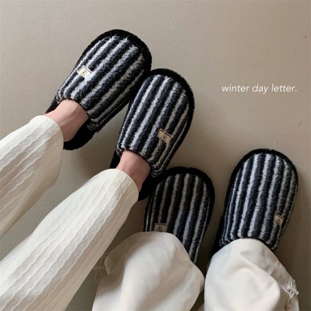 保暖毛绒家居鞋 细细条 网红个性 撞色条纹棉拖鞋 男女ins 情侣秋冬季