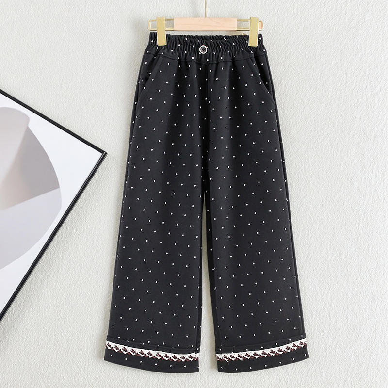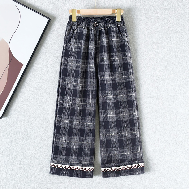 休闲长裤 中大童女孩格子花边阔腿裤 女童一体加绒加厚直筒裤 秋冬季