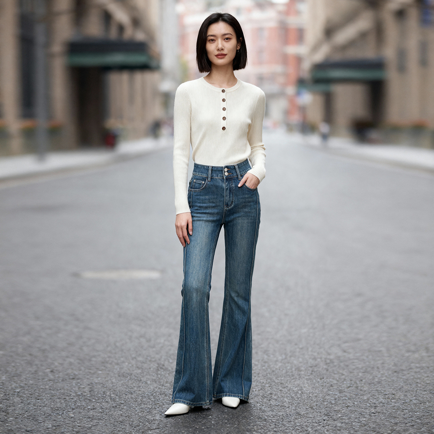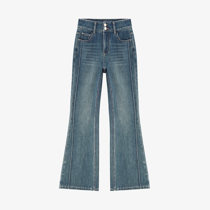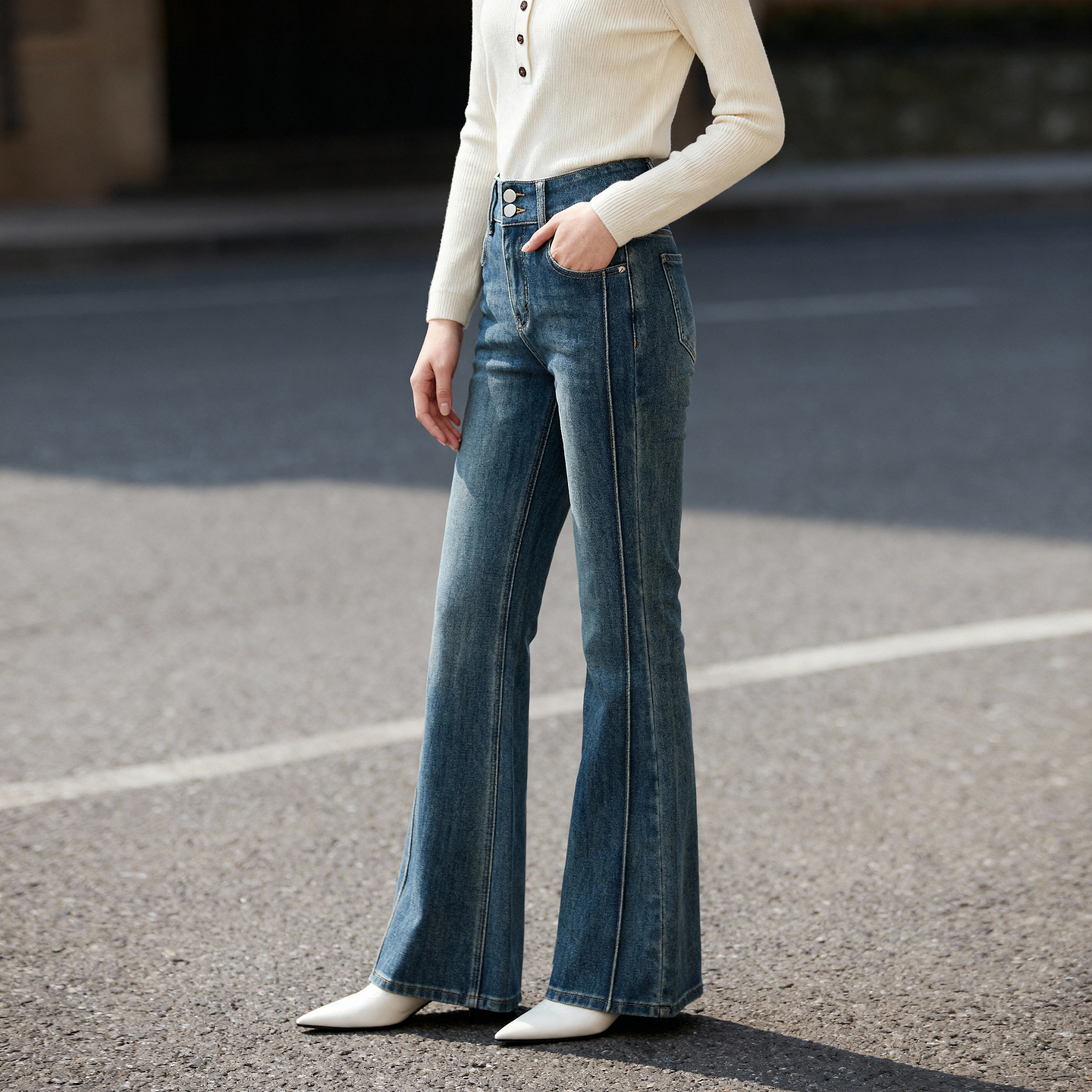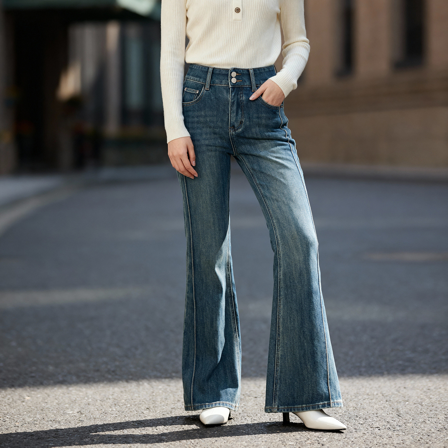 显瘦高腰喇叭长裤 Basic 女新款 百家好复古做旧微喇牛仔裤 子 House