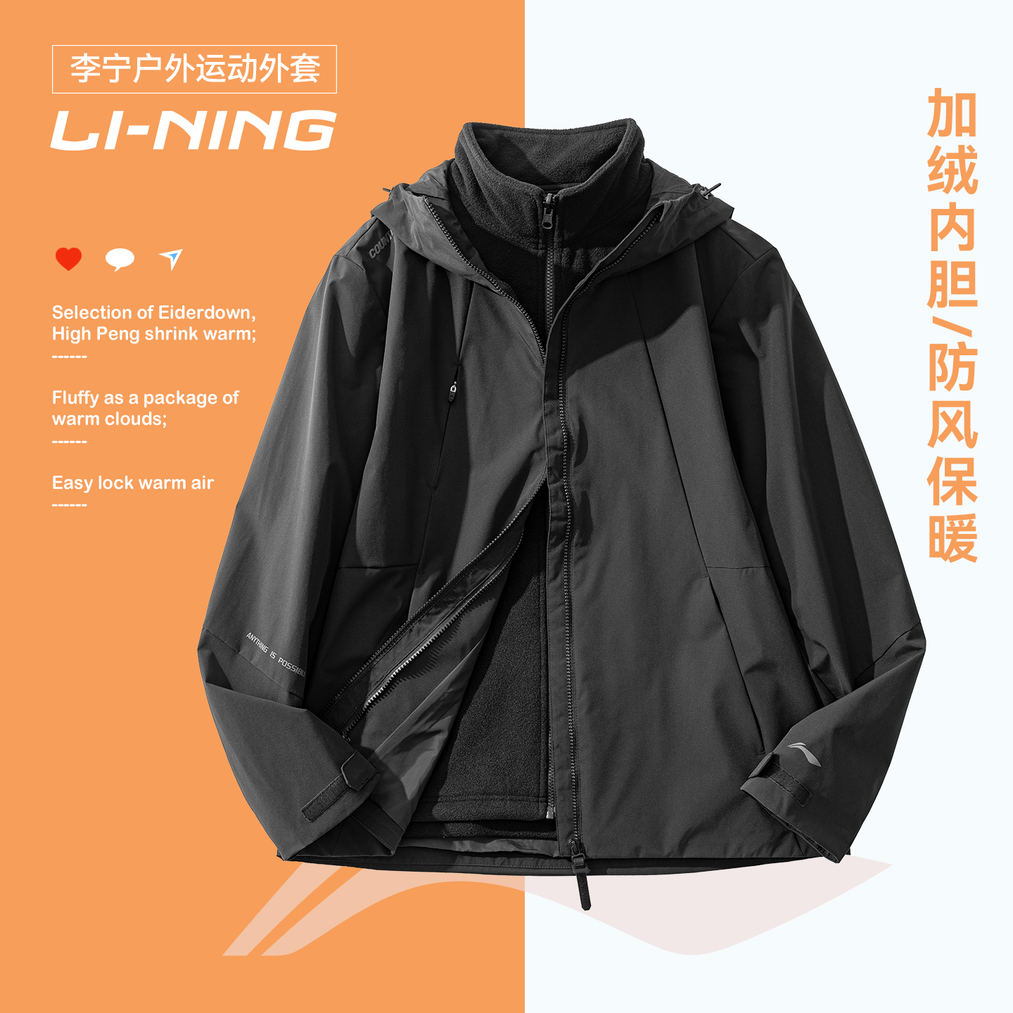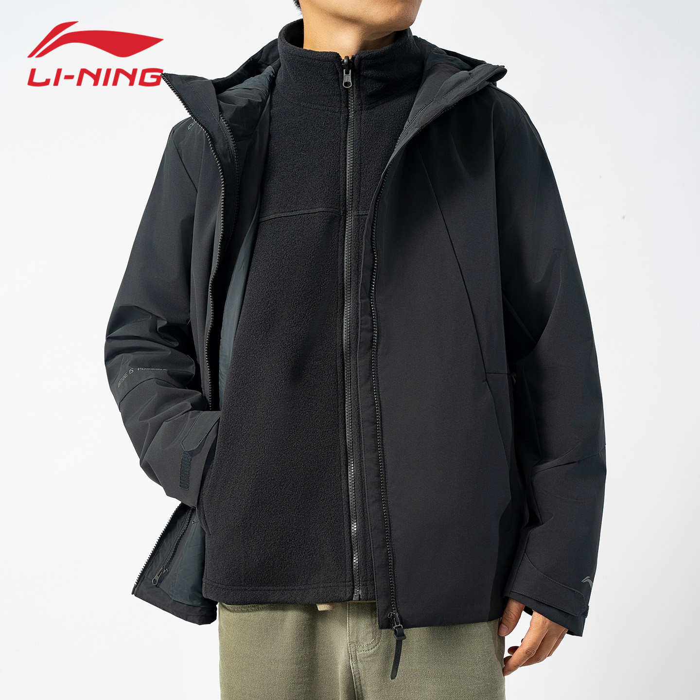 李宁三合一冲锋外套男2025新款 溯加绒防泼水保暖旅游登山运动风衣