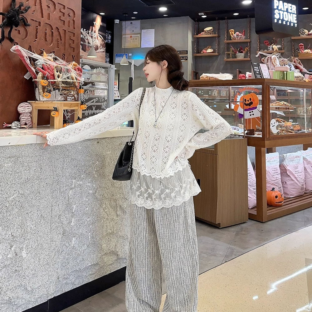 蕾丝花边拼接下摆针织打底衫 宽松中长款 女甜美清新 新款 2025秋冬季