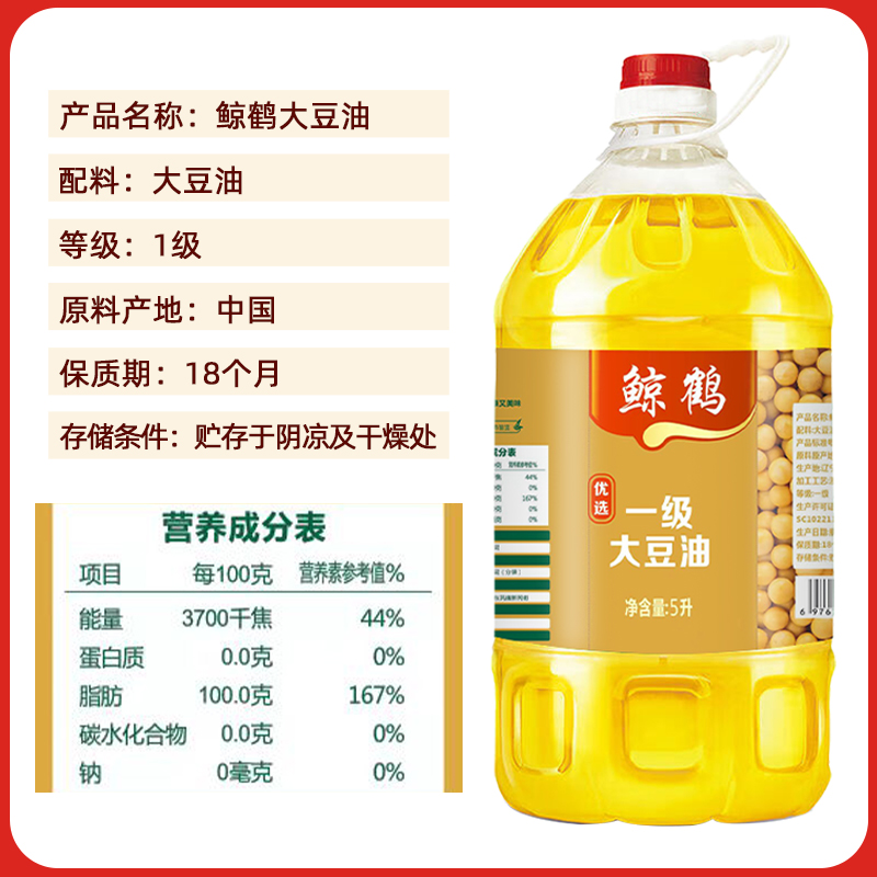 炒菜家用健康营养5L大豆油烹饪 家庭装 鲸鹤优选一级大豆油 转基因