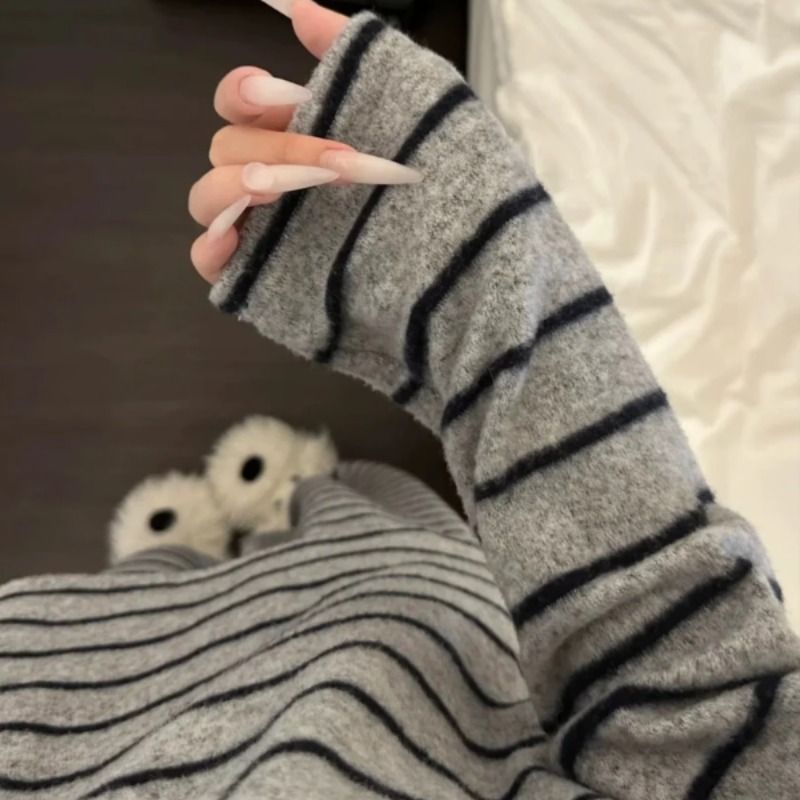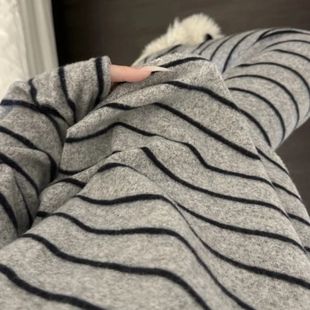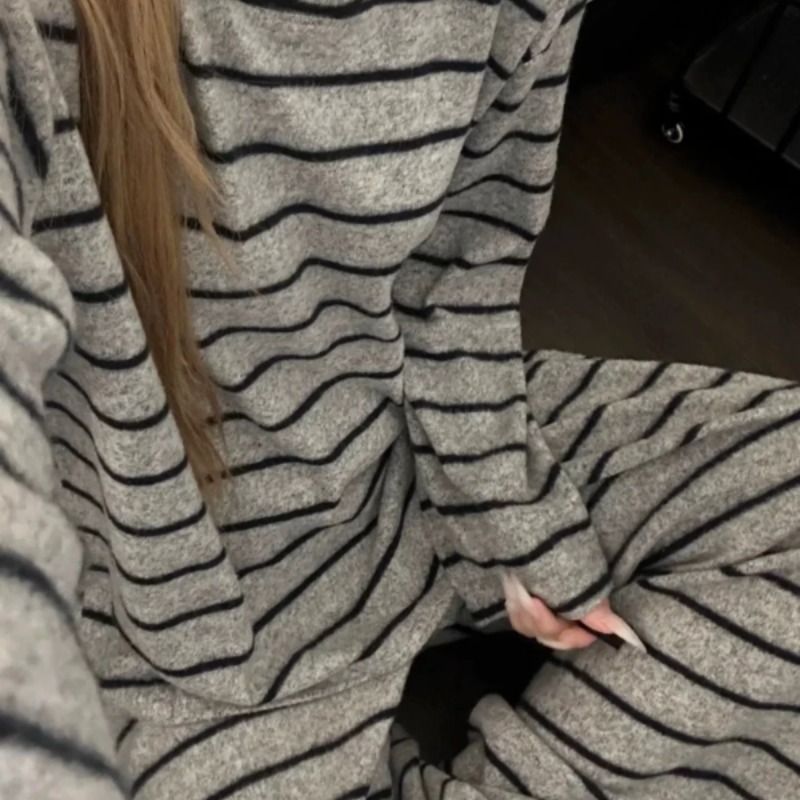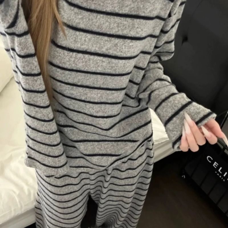 宽松德绒家居服套装 长裤 ins简约条纹睡衣女学生保暖圆领长袖 韩版