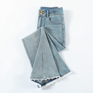 女款 秋季 新款 经典 蕾丝边喇叭裤 休闲微喇牛仔裤 高腰显瘦修身 蓝韩版