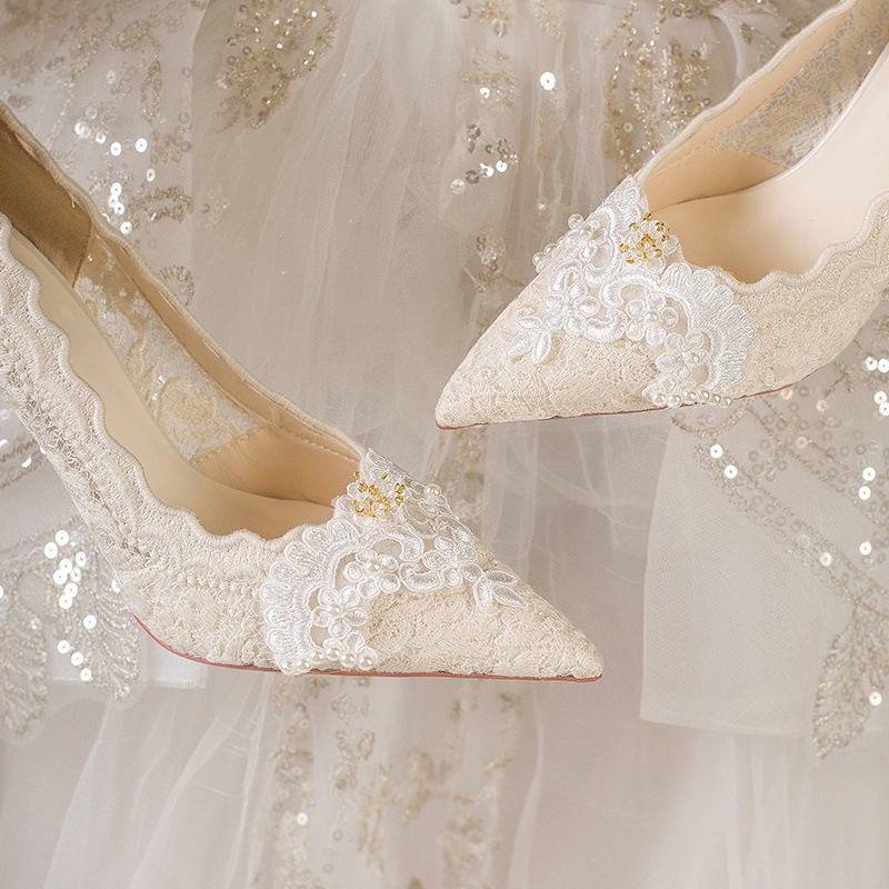 订婚细跟气质新娘鞋 绝美法式 白色主婚纱蕾丝高跟鞋 女2025新款 婚鞋