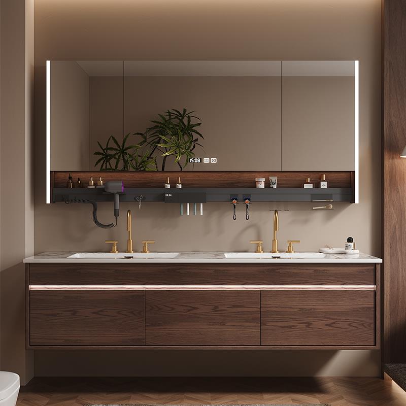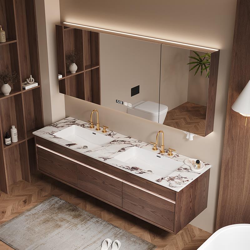 中古风浴室柜侘寂风红橡木岩板无缝陶瓷一体洗漱盆洗手台实木复古