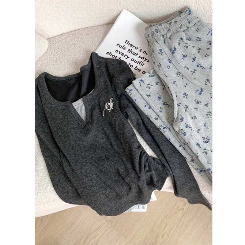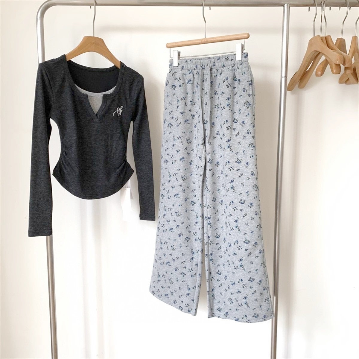 两件套 撞色上衣百搭休闲阔腿长裤 甜辣风穿搭ins撞色大码 收腰长袖