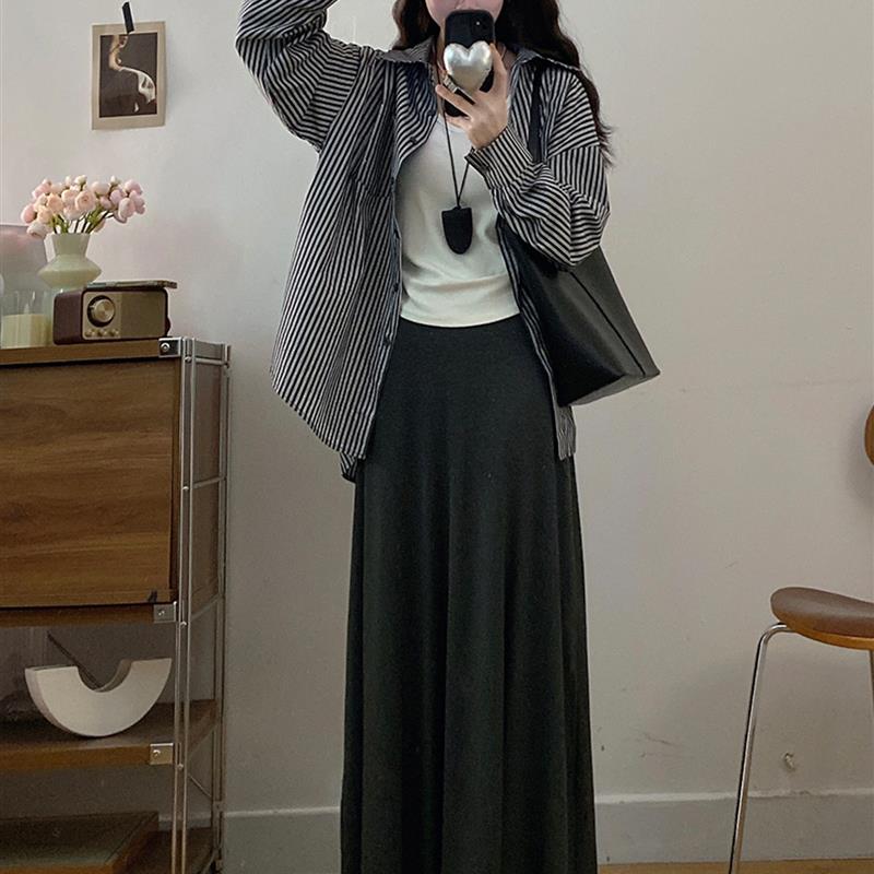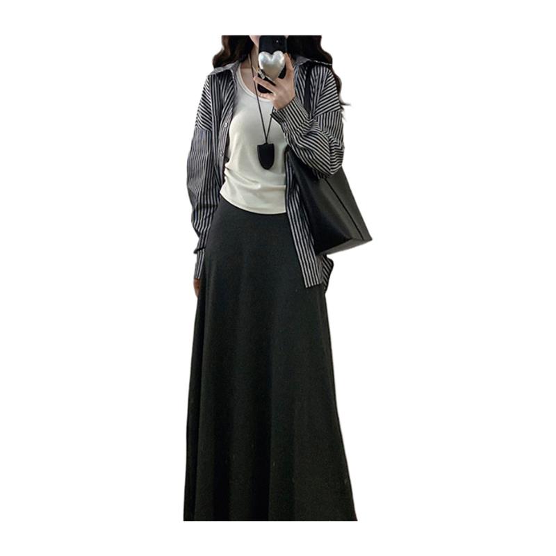 胖mm慵懒条纹衬衫 大码 背心半身裙三 2025新款 现货韩系早秋穿搭套装