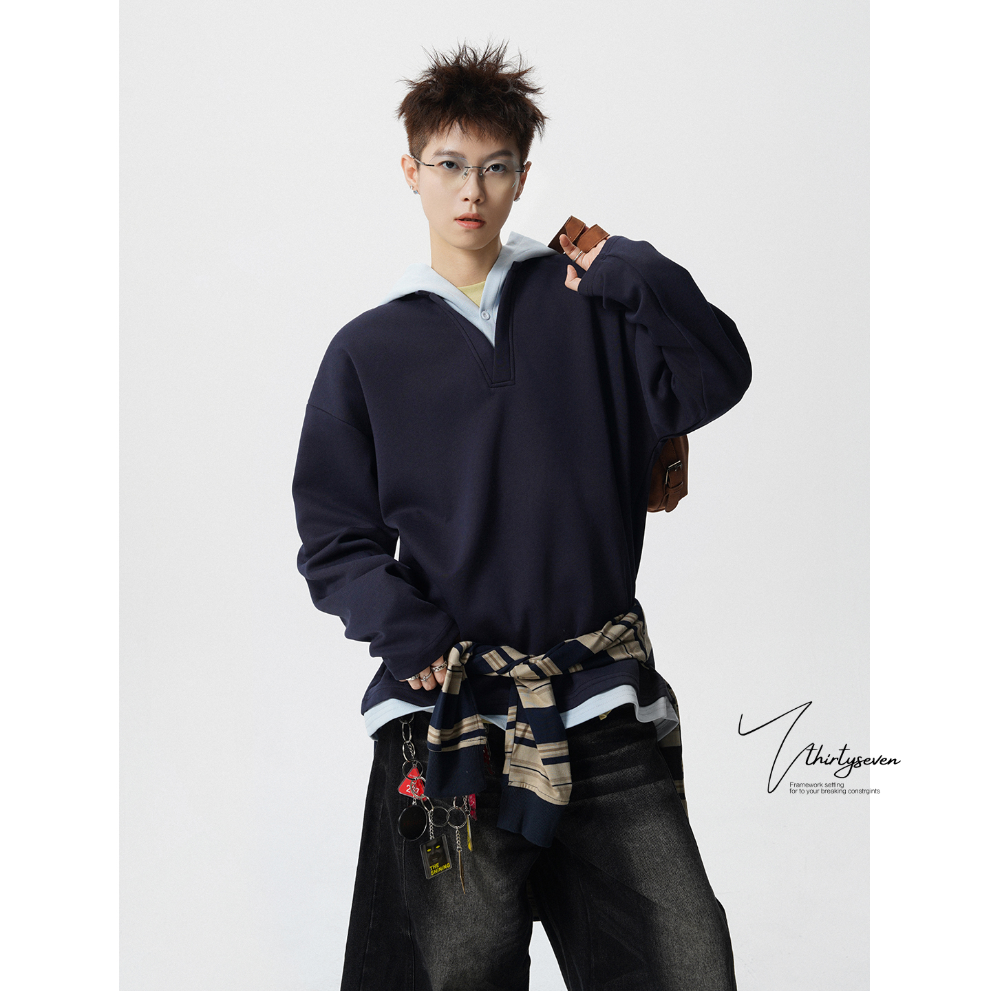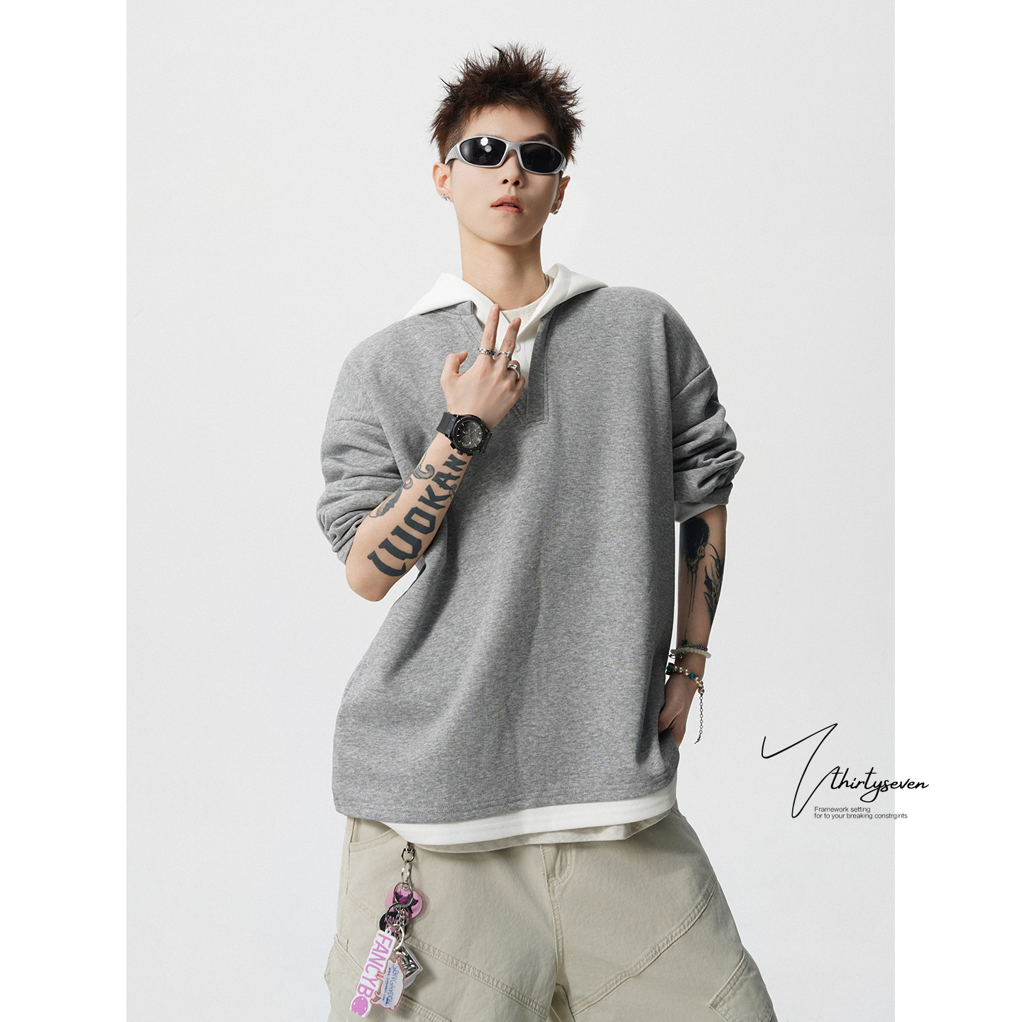 V37美式 高街设计感V领情侣百搭外套 复古拼接假两件连帽卫衣男秋季