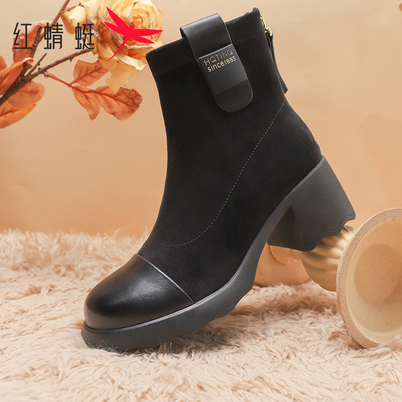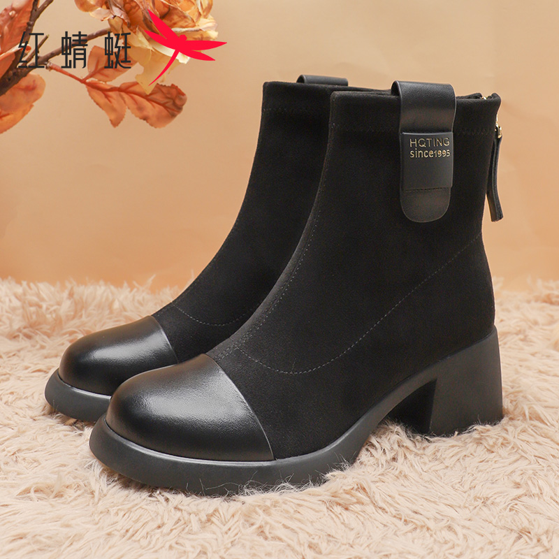 百搭增高显瘦短靴防滑粗跟舒适时装 红蜻蜓女鞋 时尚 新款 靴 2025冬季