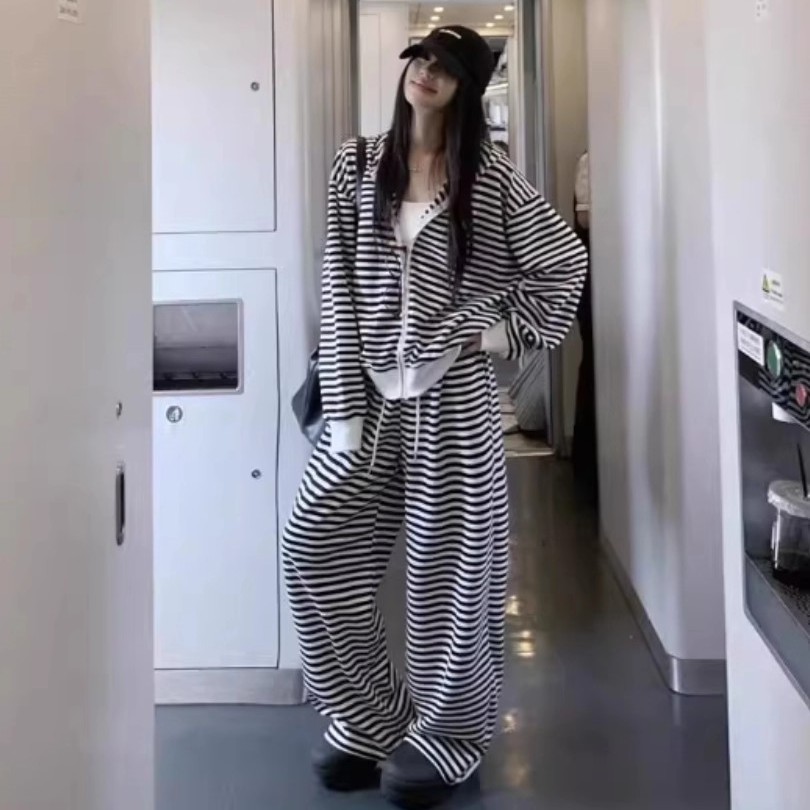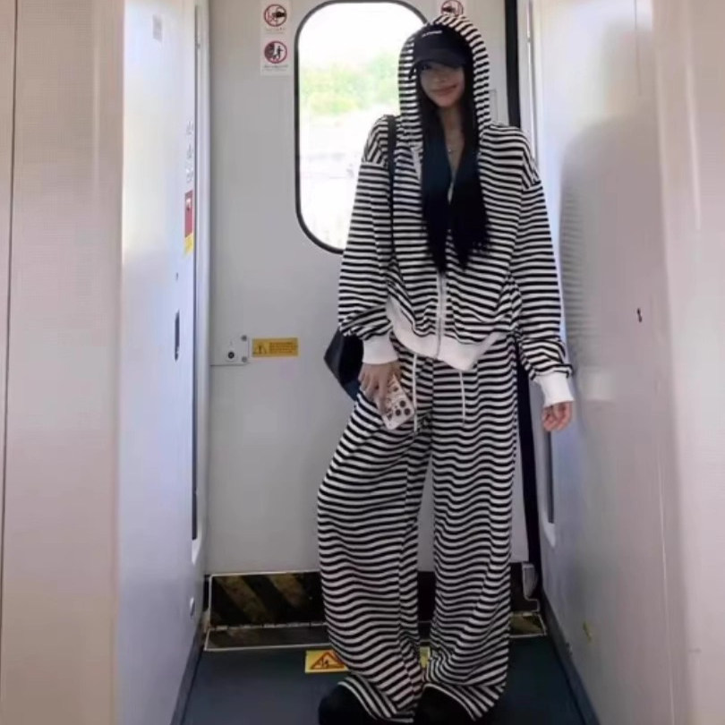 连帽休闲卫衣阔腿裤 2025早春新款 条纹运动睡衣情侣套装 设计感时尚